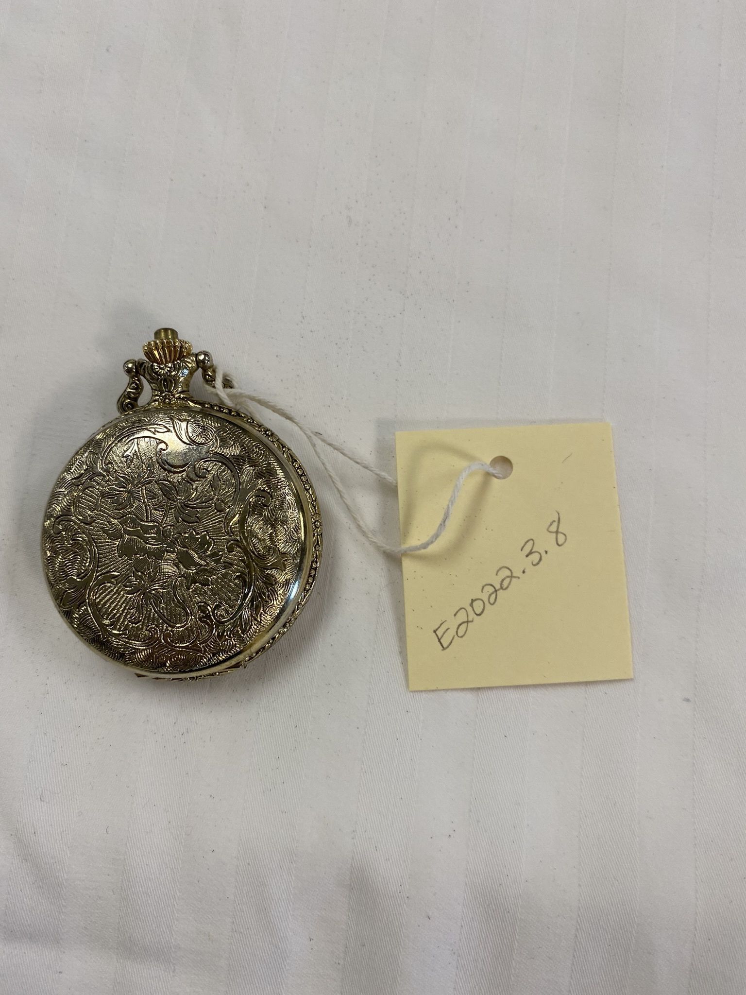 Gold plated pocket watch. Floral design on the front and the back of the watch.