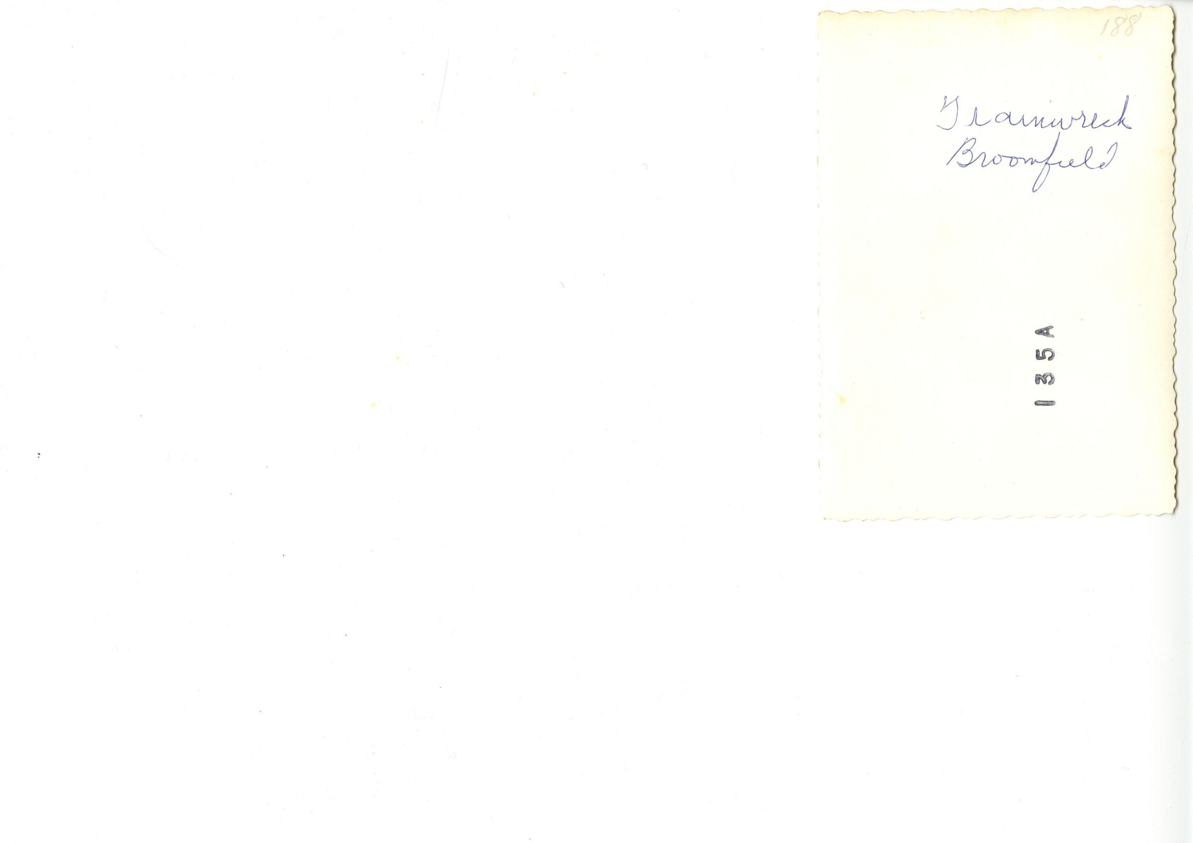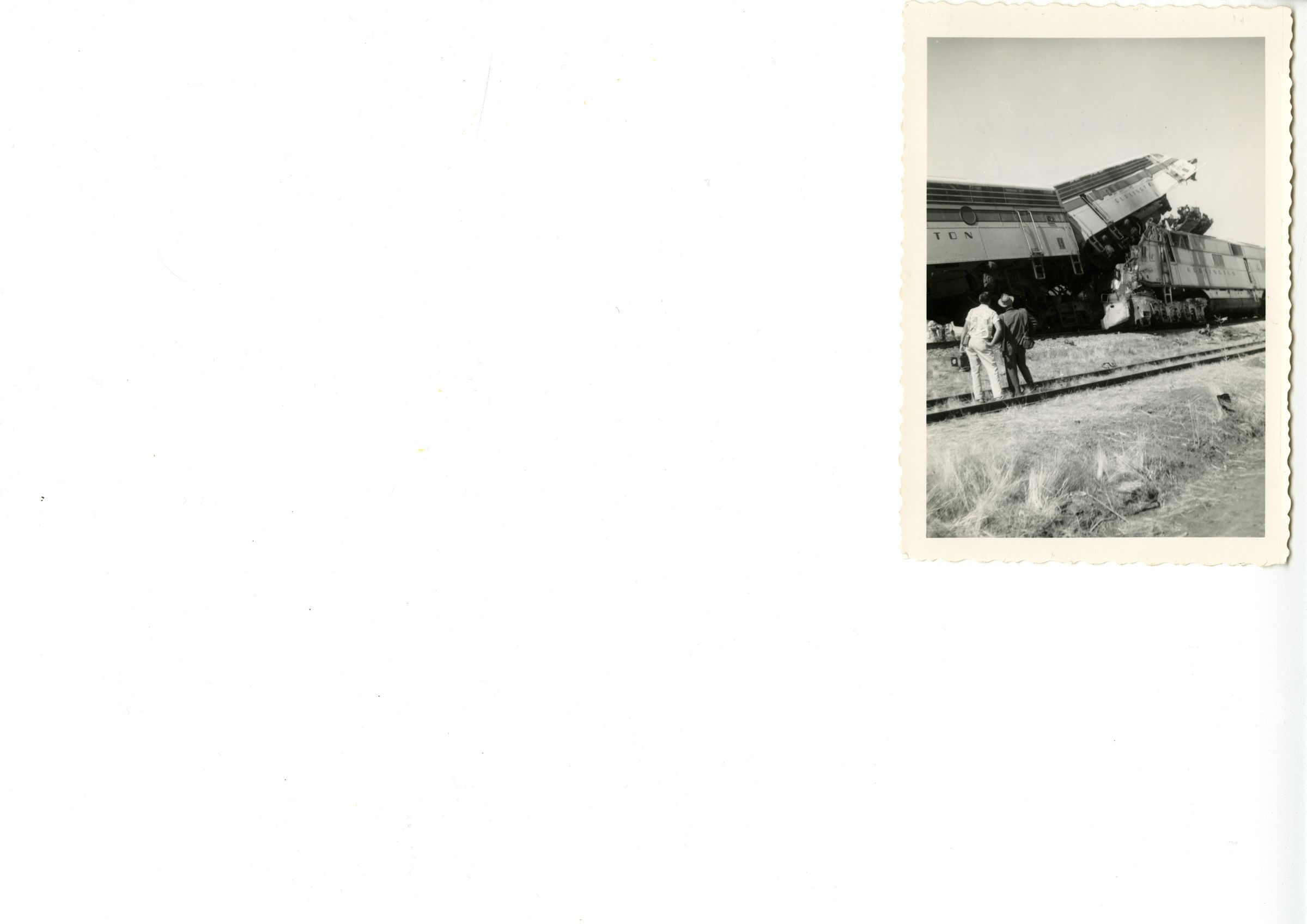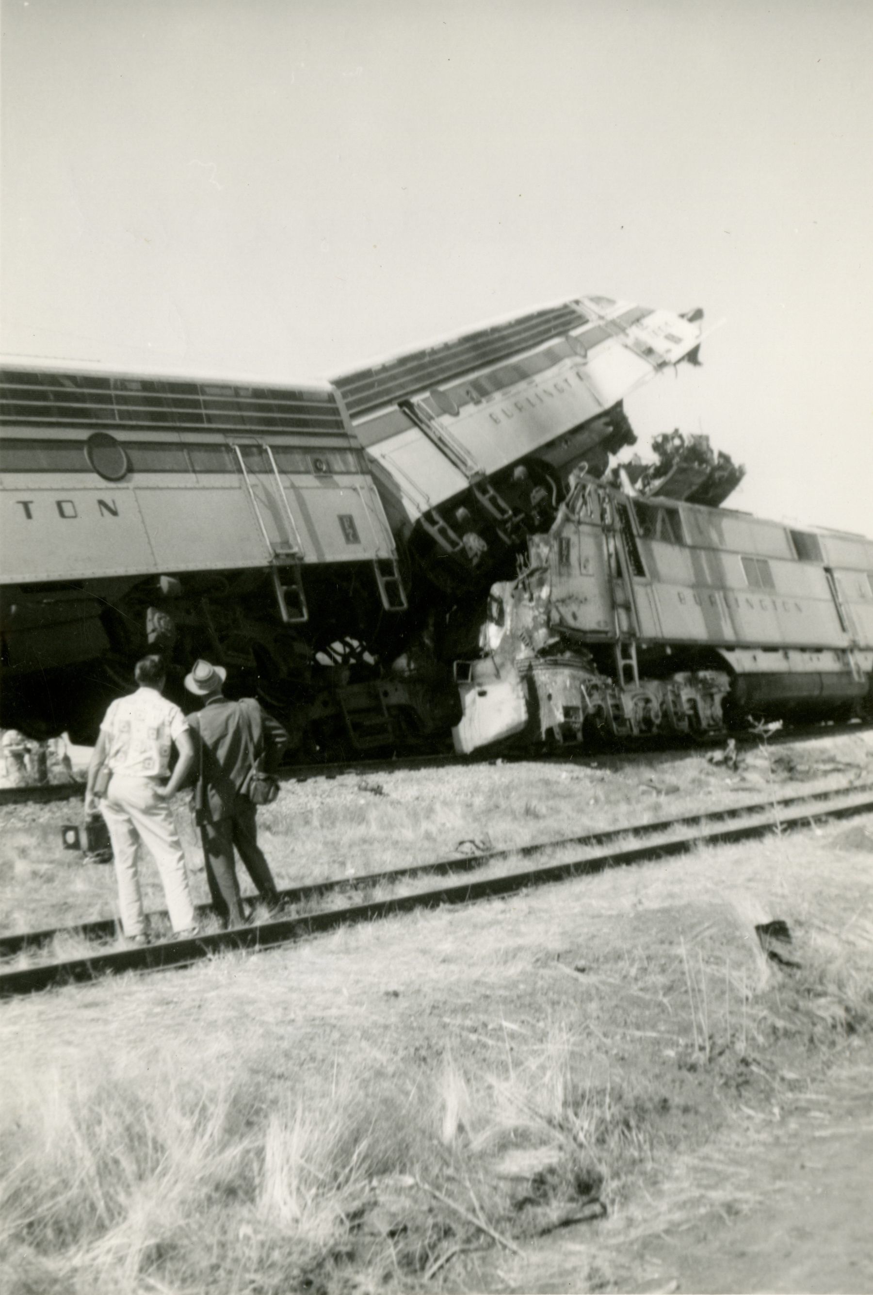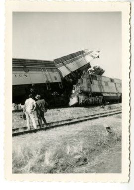 1958 Train wreck, Broomfield; two men standing, looking at the wreck.