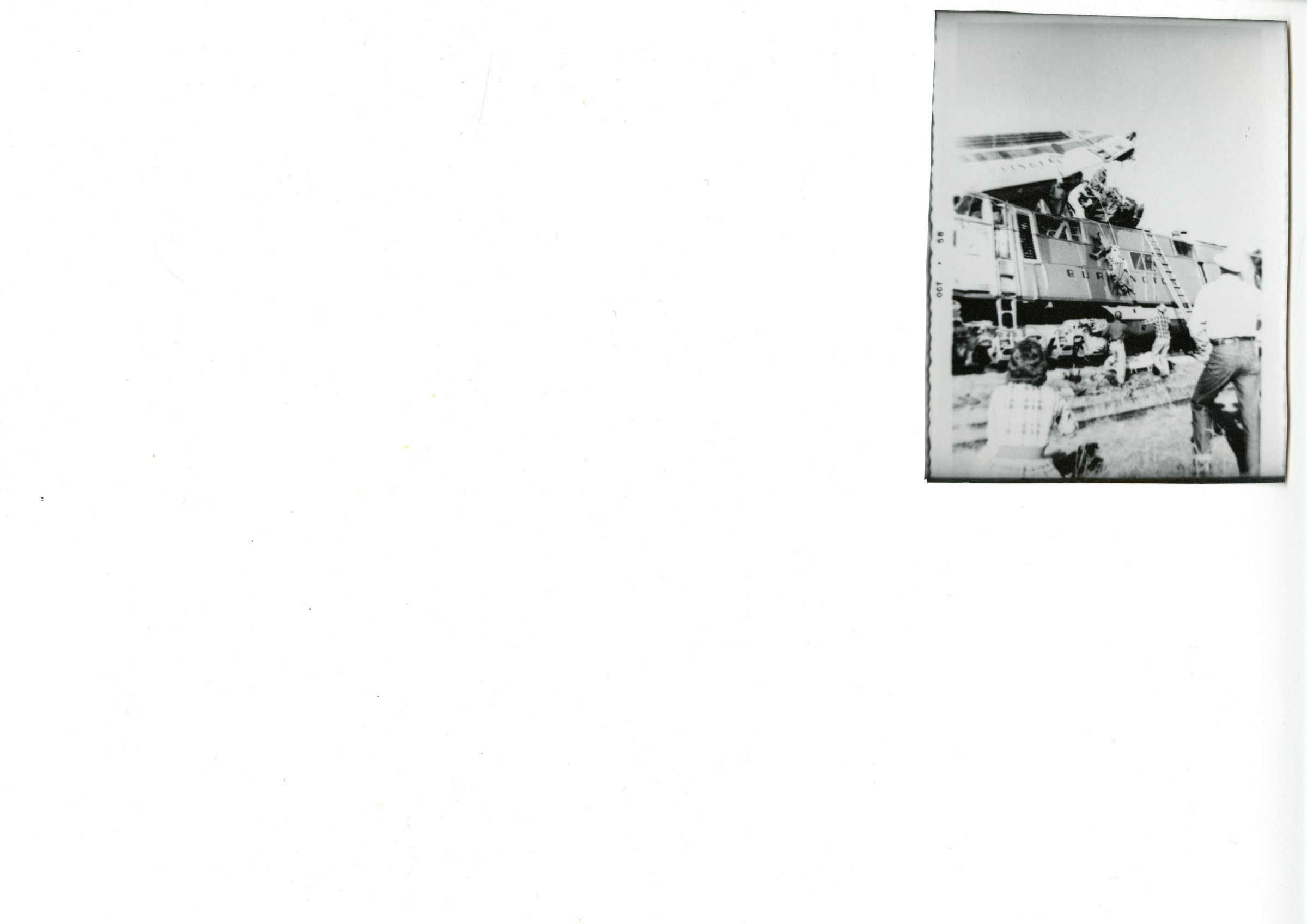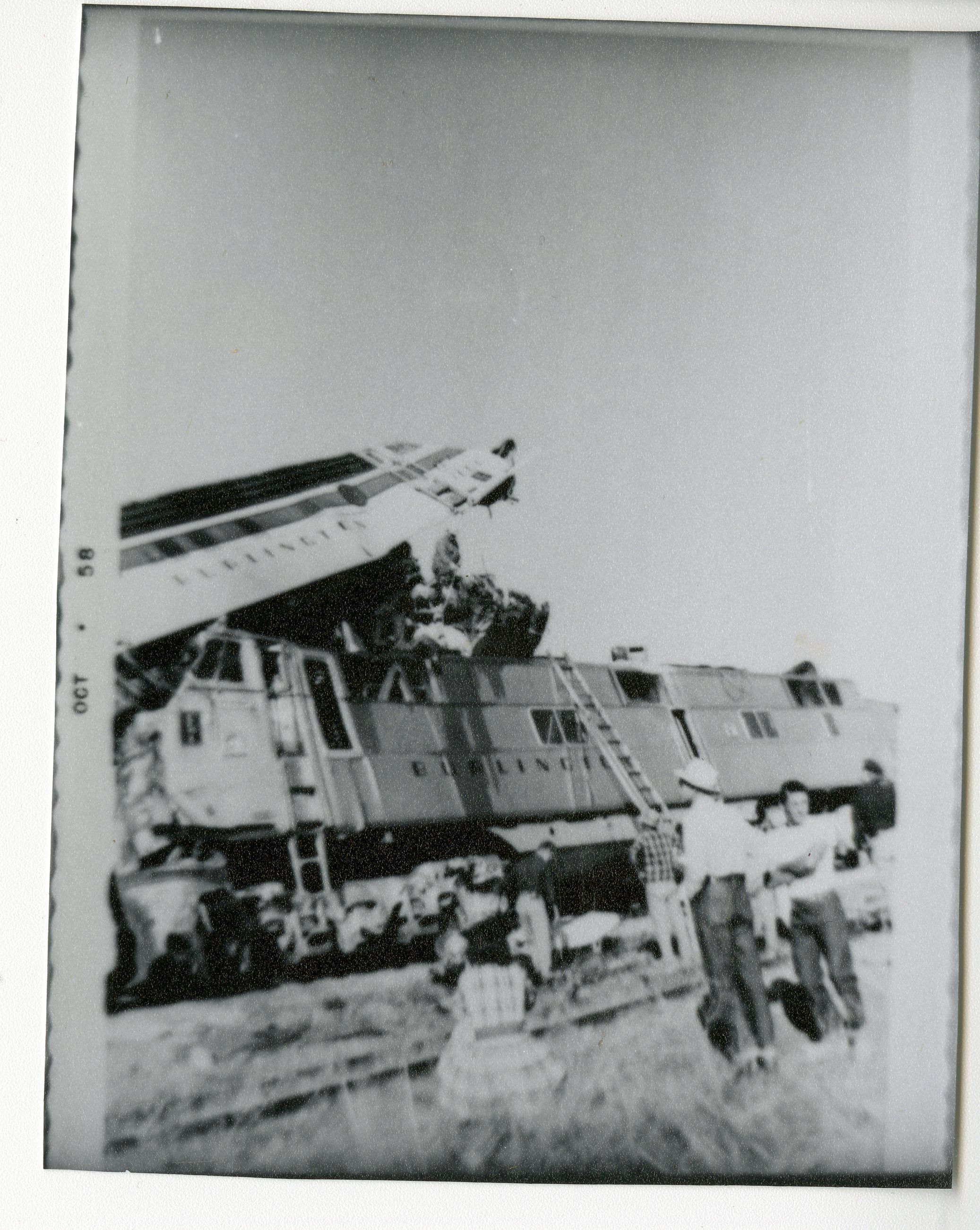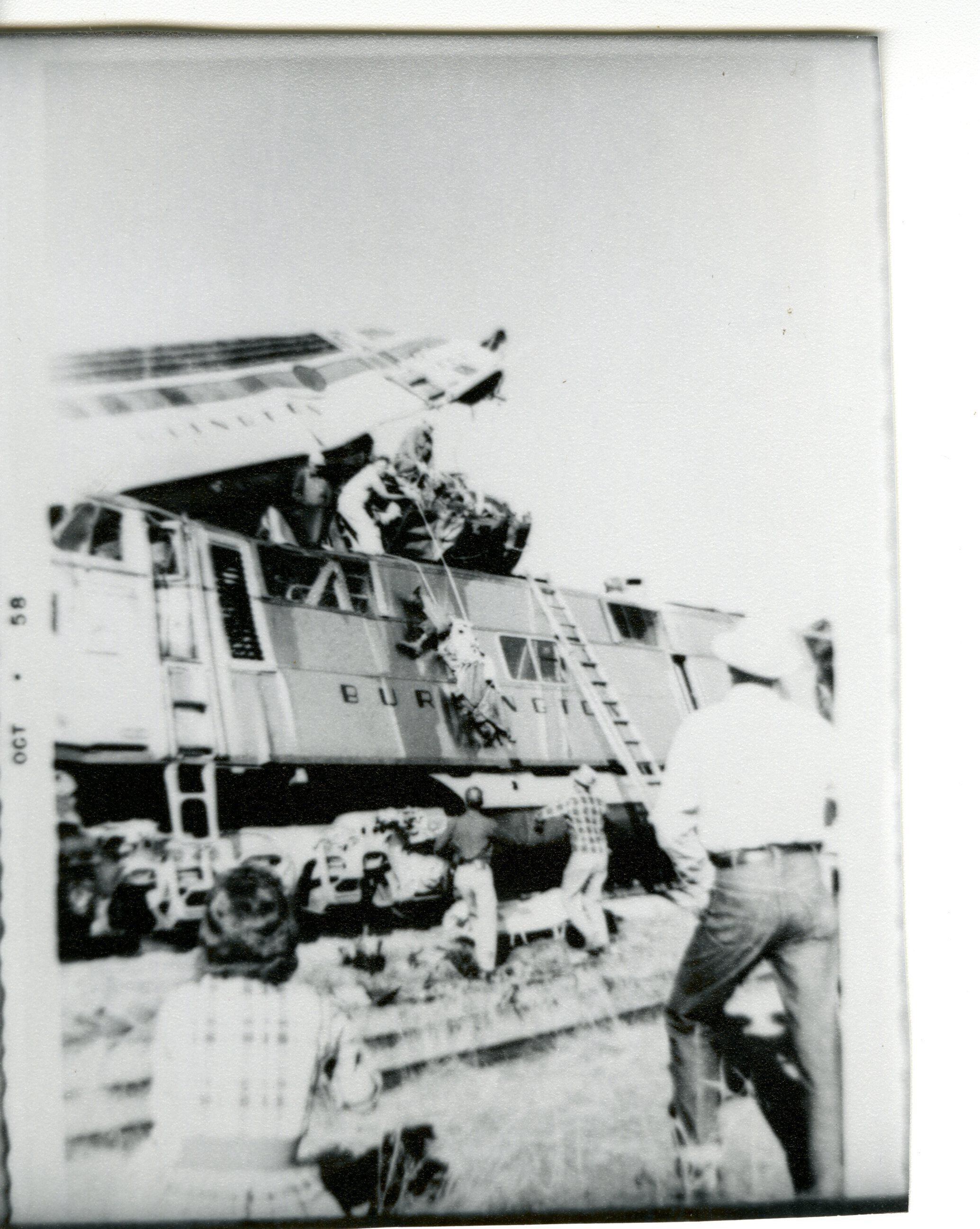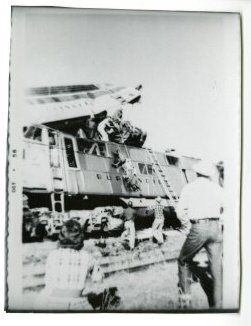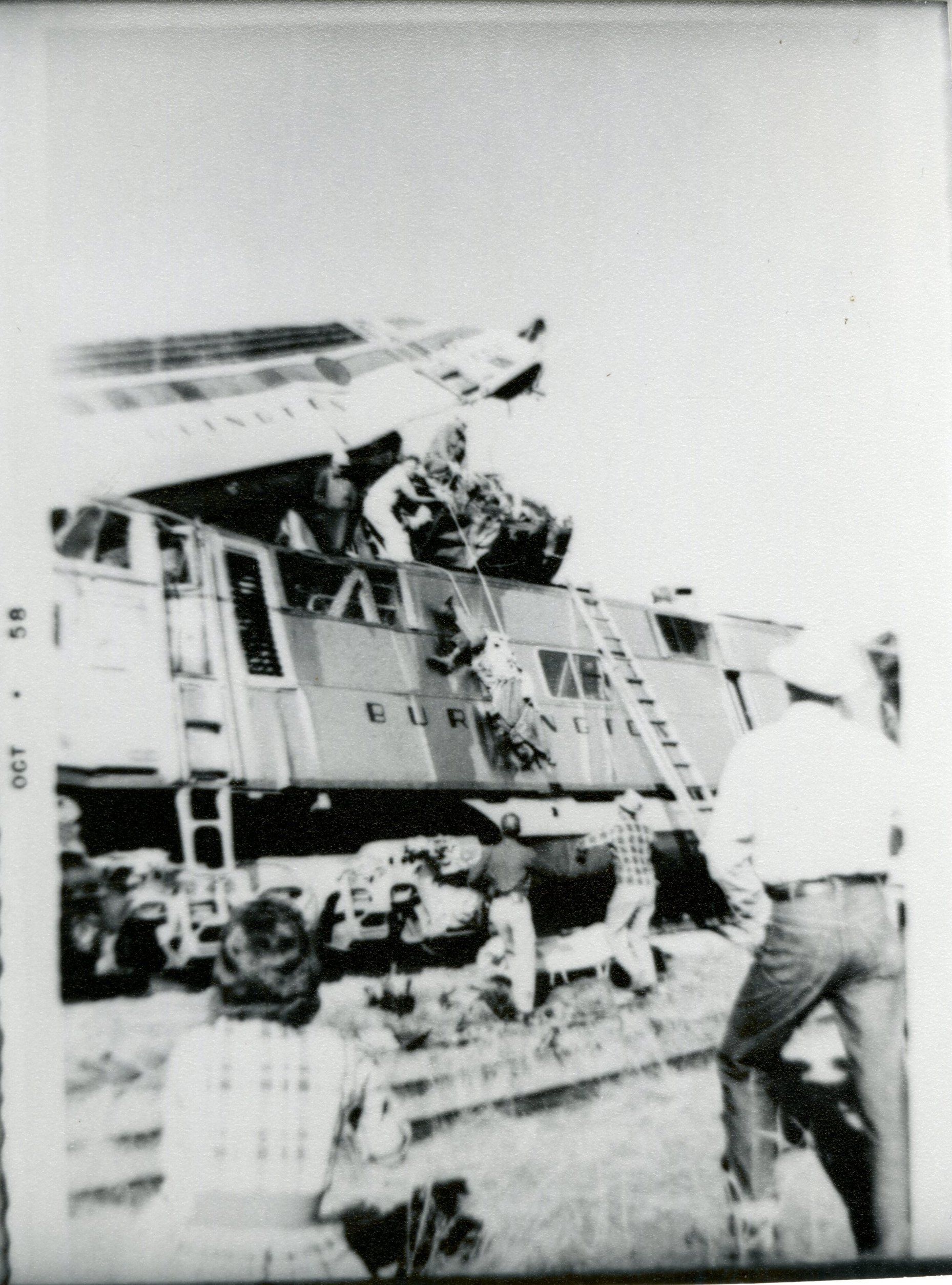 Black-and-white photo. Removal of the body of a victim of the September 22, 1958 train wreck. Two men lower the wrapped body down the side of the wrecked engine where two other men wait below with a stretcher. A man and a woman look on in the foreground.