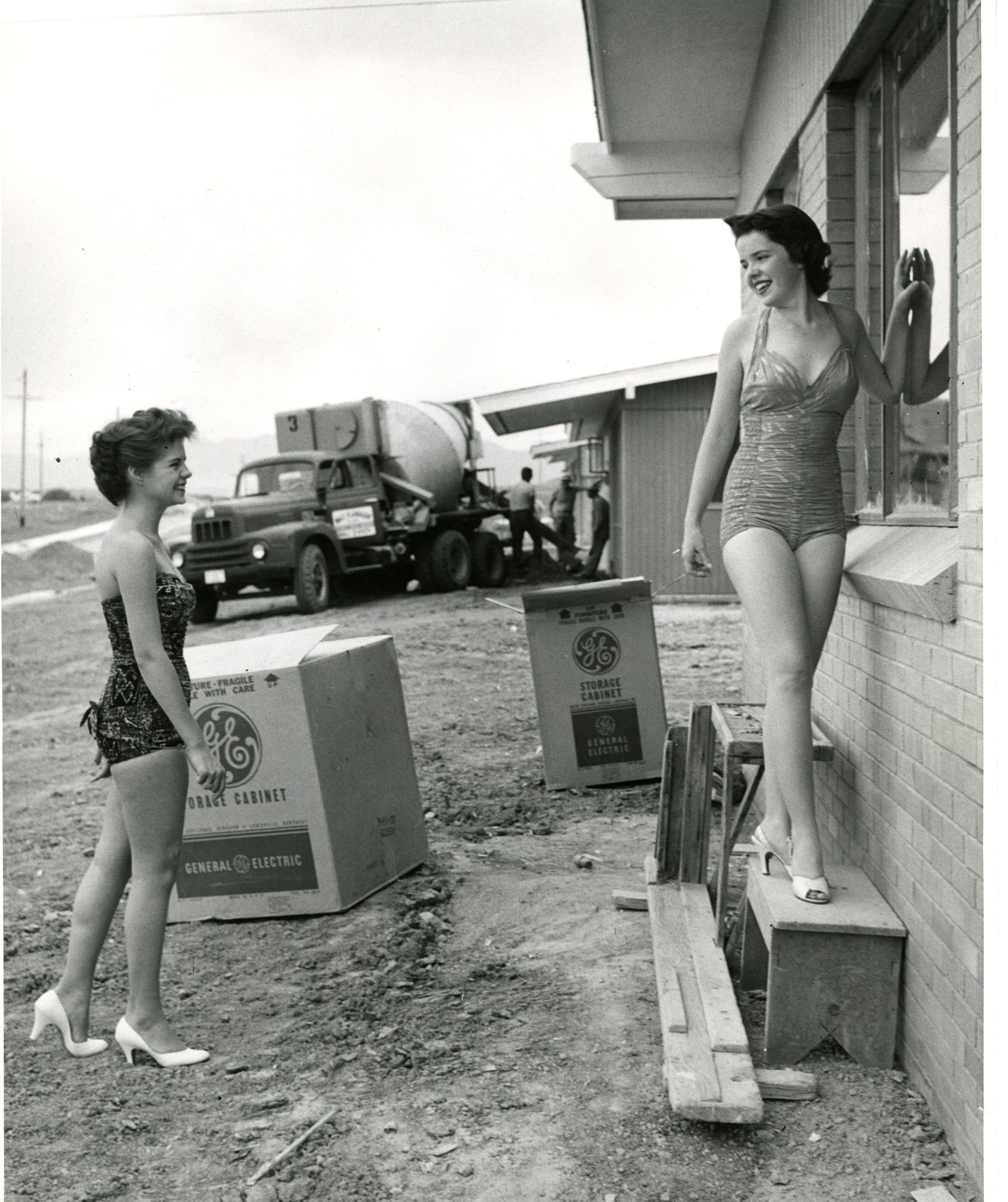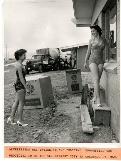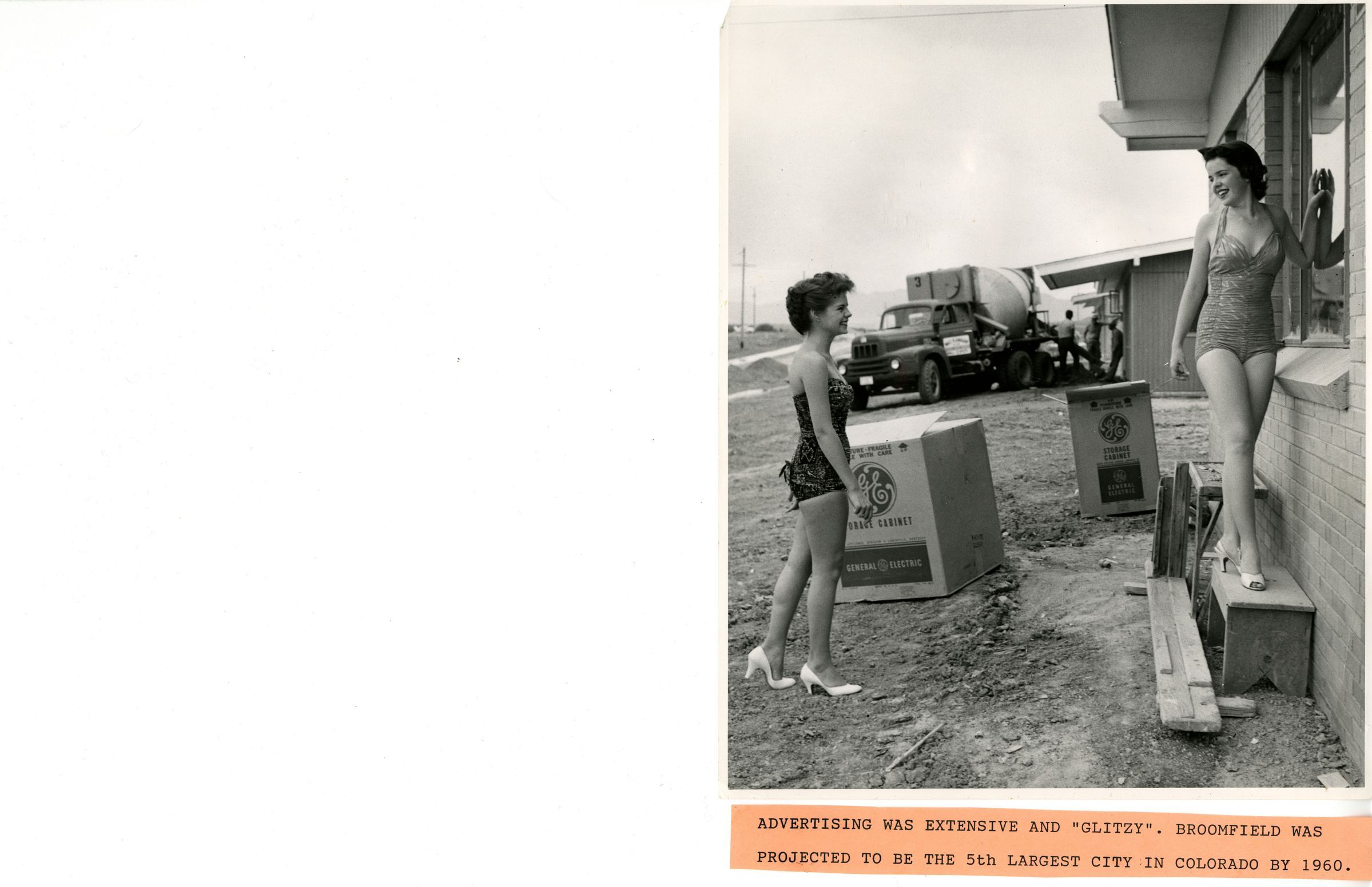 B&W photo of two, unidentified women posing in front of construction sight. The women are dressed very provocatively. Photo was used in an ad for Broomfield Heights. Originally there was a description that said "Advertising was extensive and 'glitzy.' Broomfield was projected to be the 5th largest city in Denver by 1960." However, it has been lost.
