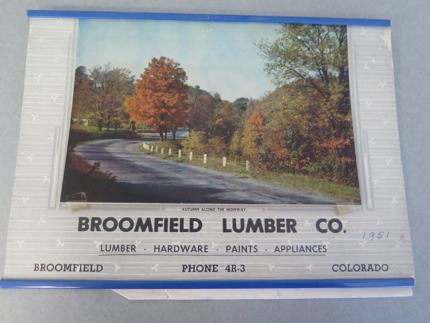 Broomfield Lumber Co. Calendar from 1951 with a photo captioned "Autumn along the Highway" on the front