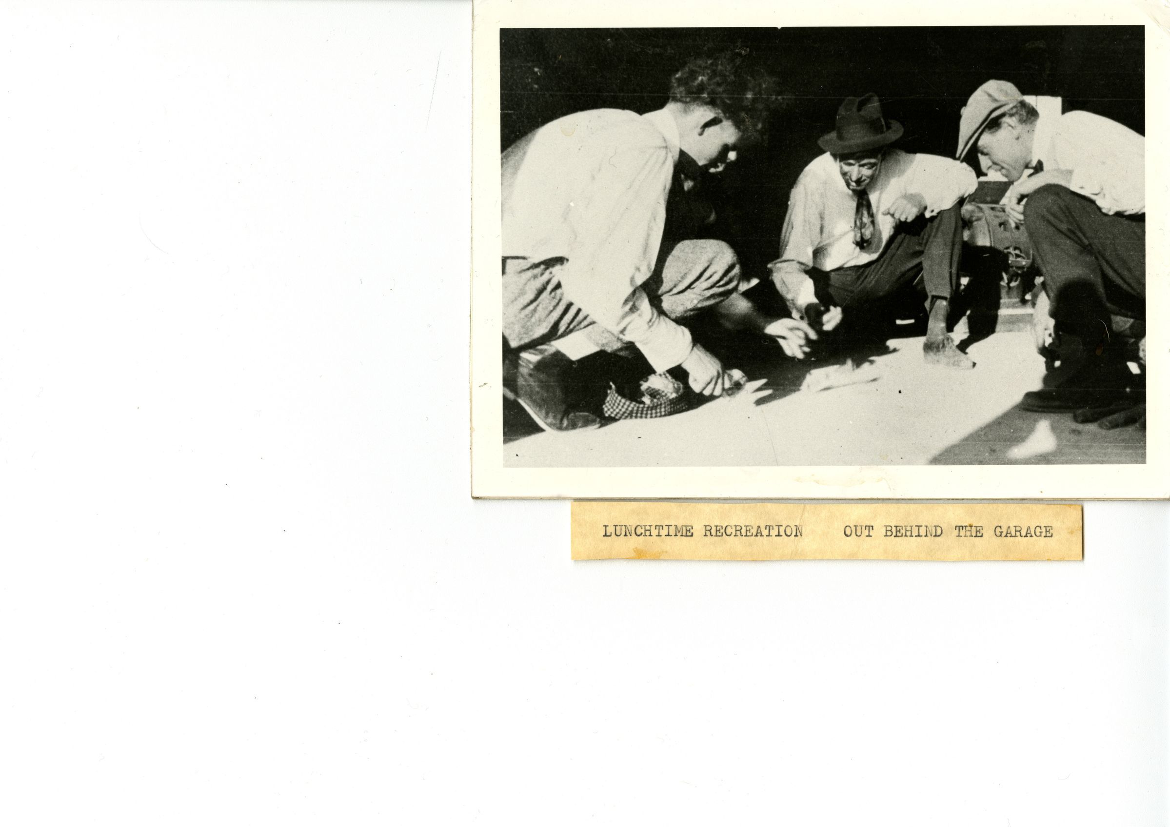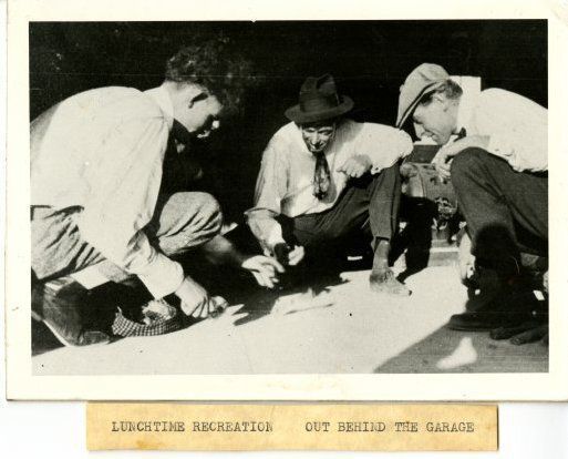 Men rolling dice behind the Broomfield garage.