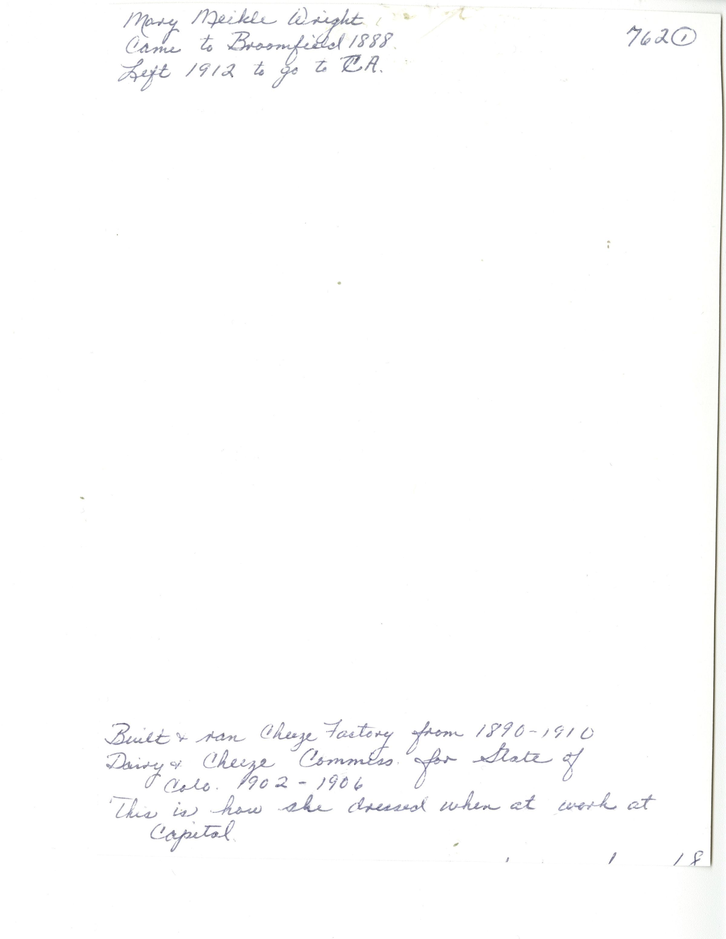 Written on top back: "Mary Meikle Wright. Came to Broomfield 1888. Left 1912 to go to CA."