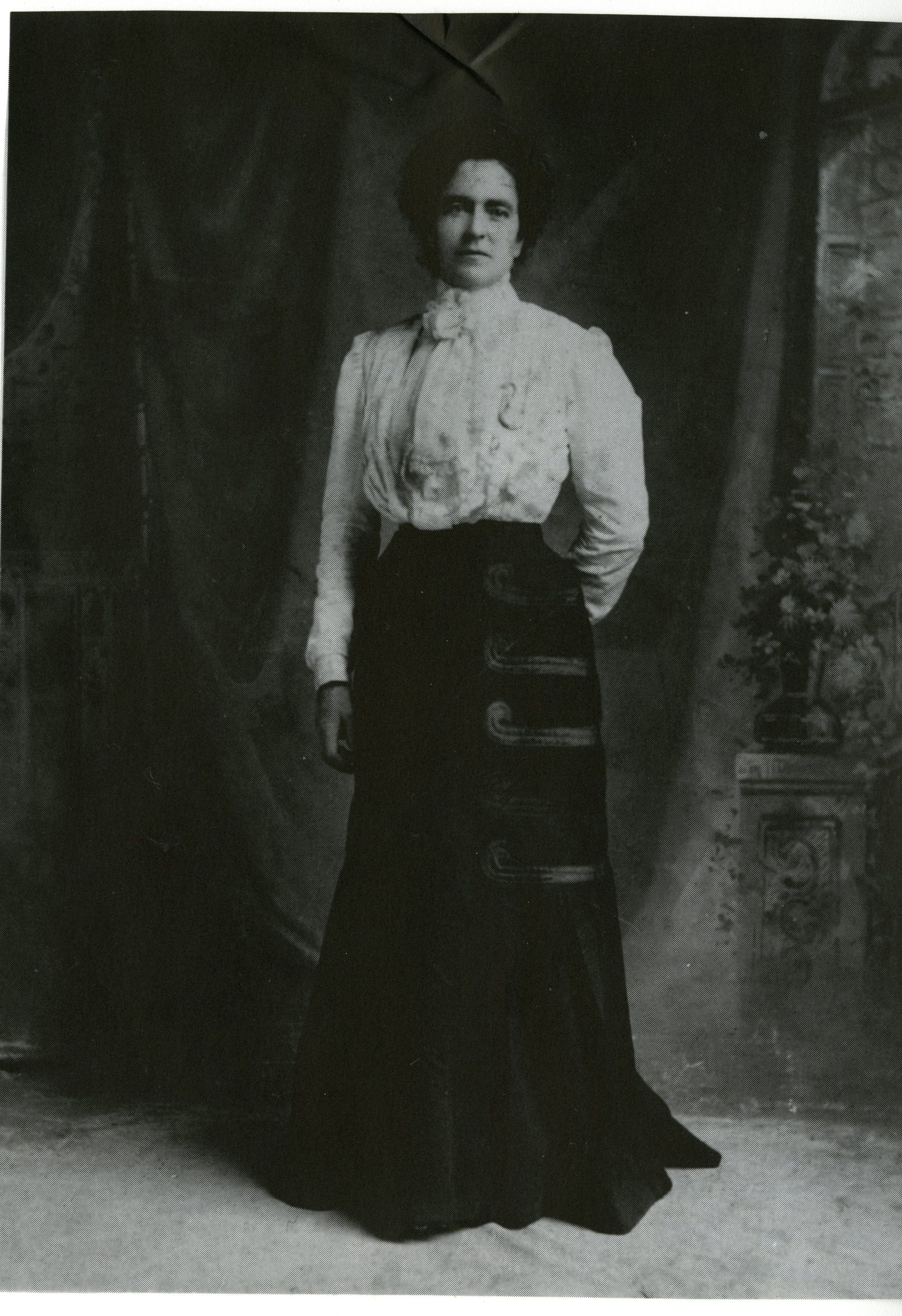 Photo of Mary Wright, black and white. Subject in blouse, dark skirt, standing in center of composition.