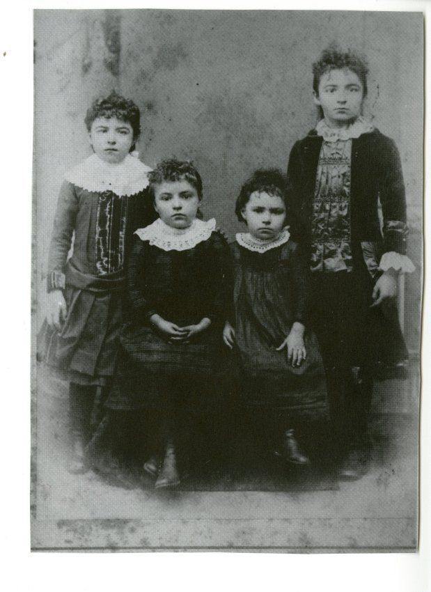 Photo of four children, black and white. Two are sitting, two standing, one on either side of them. All four are wearing dark dresses with white collars.