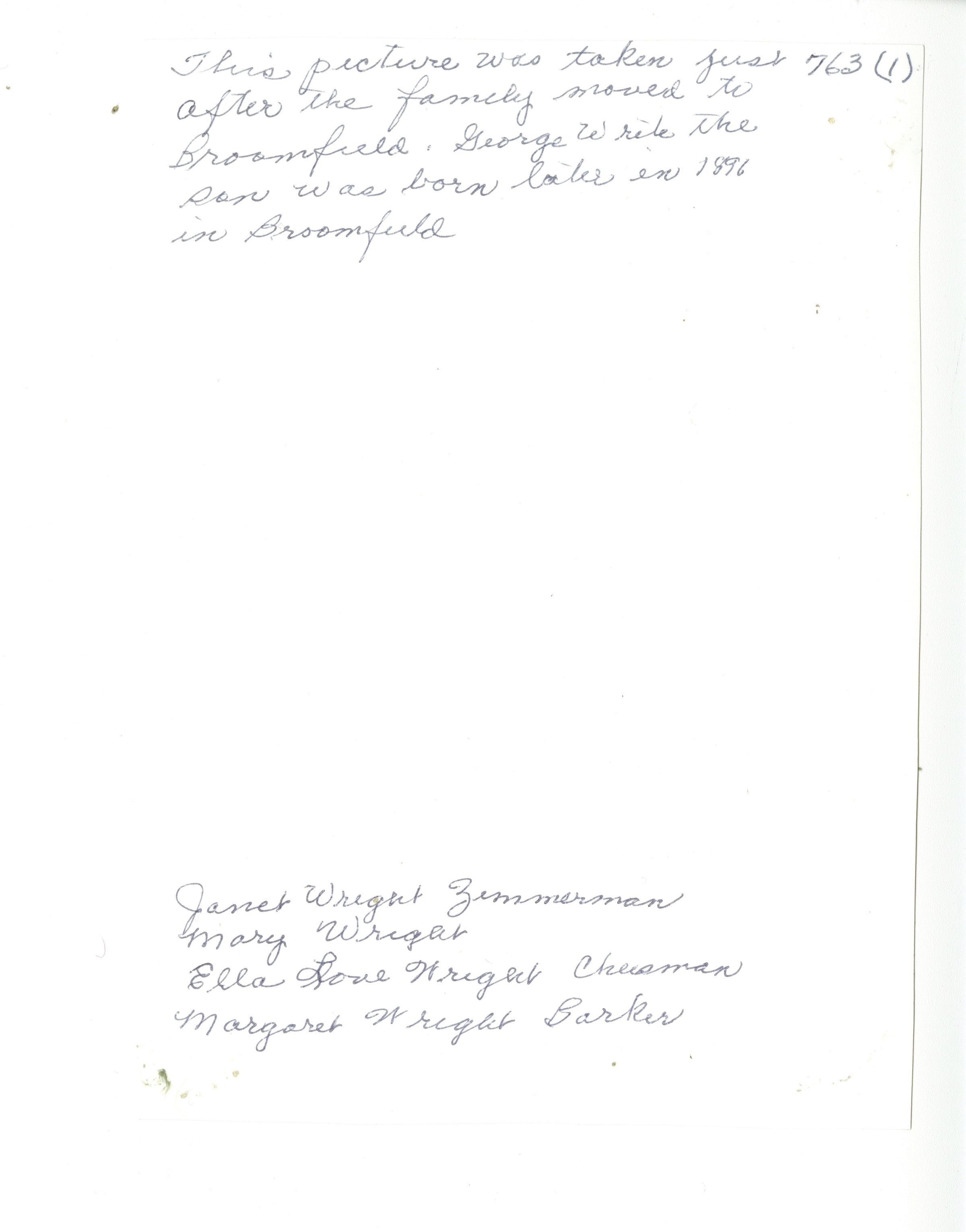 Written on back top: "This picture was taken just after the family moved to Broomfield. George Wright the son was born later in 1896 in Broomfield."