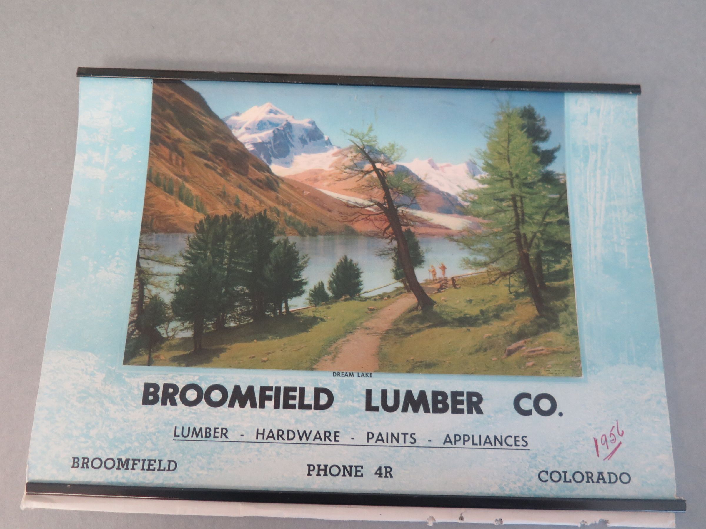 Broomfield Lumber Co. Calendar from 1956 with a photo captioned "Dream Lake" on the front
