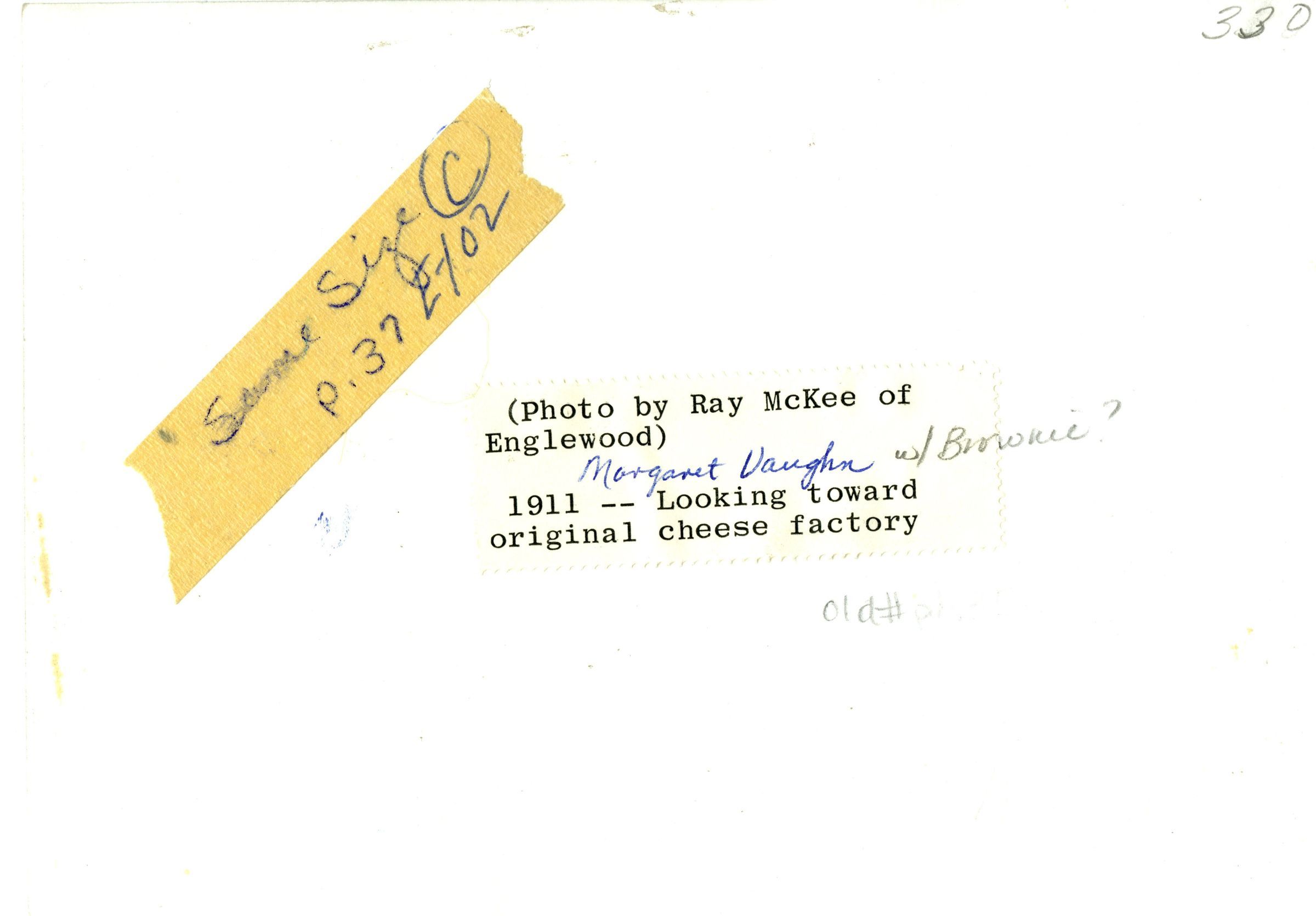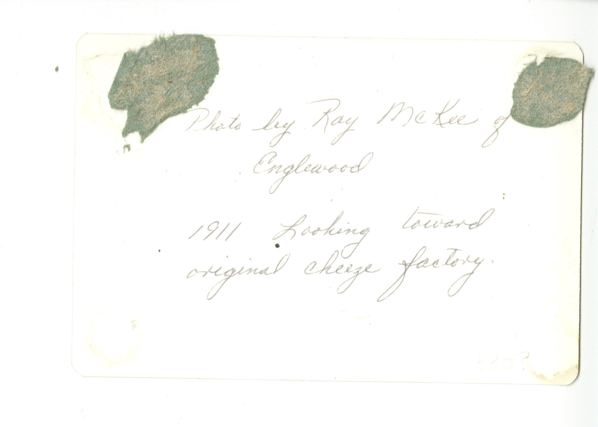 Written on back: "Photo by Ray McKee of Englewood. 1911 Looking toward original cheese factory."