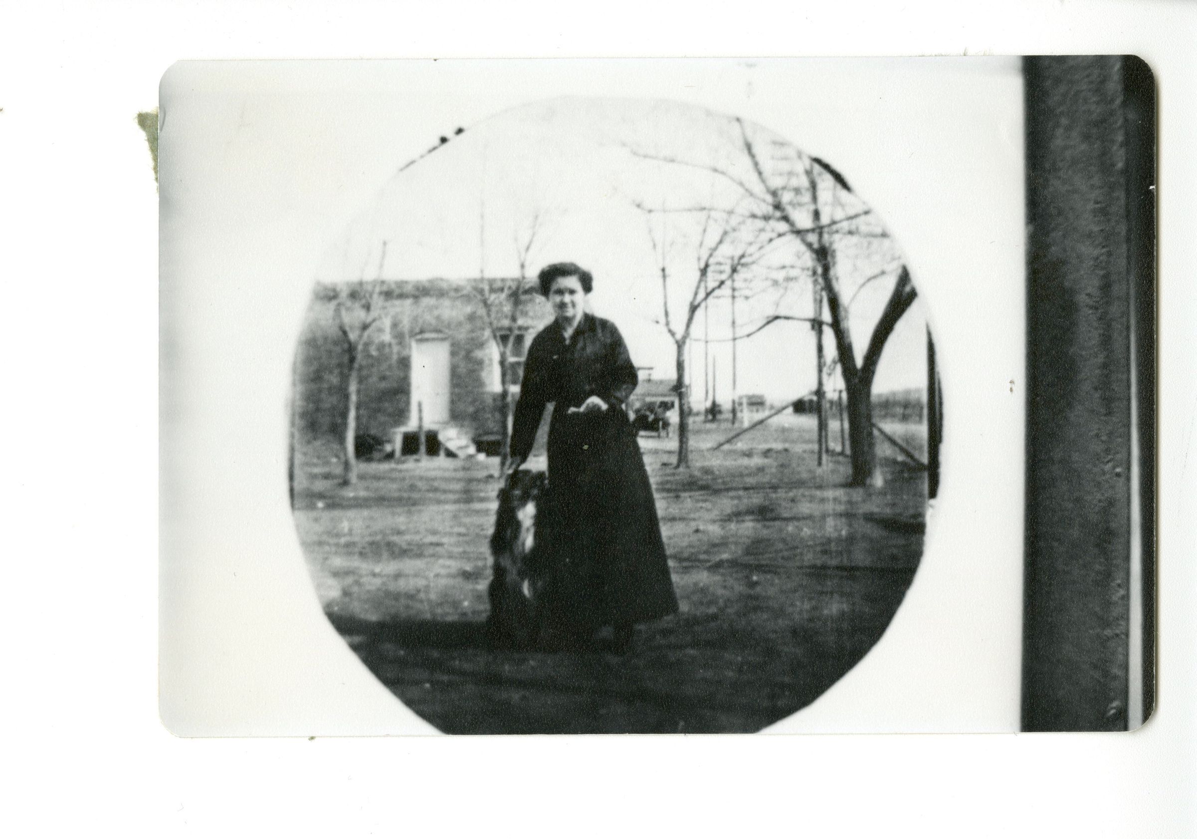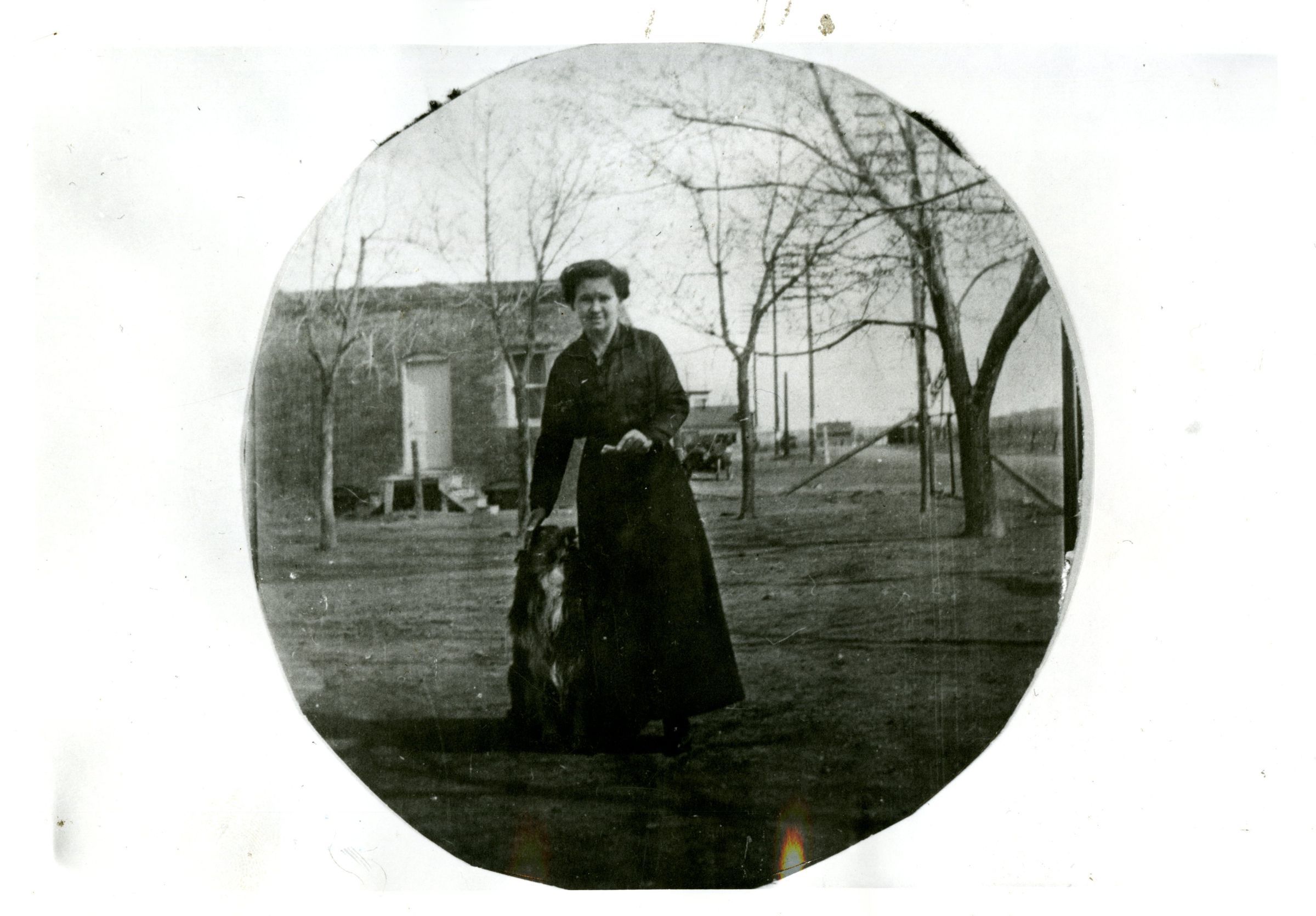 Photo black and white, circle framing subject. Woman standing in a dark dress, beside a dog. Behind her is a building and some bare trees. Black strip from photo scan alongside the right of the object. On back: two spots where backing didn't come off.