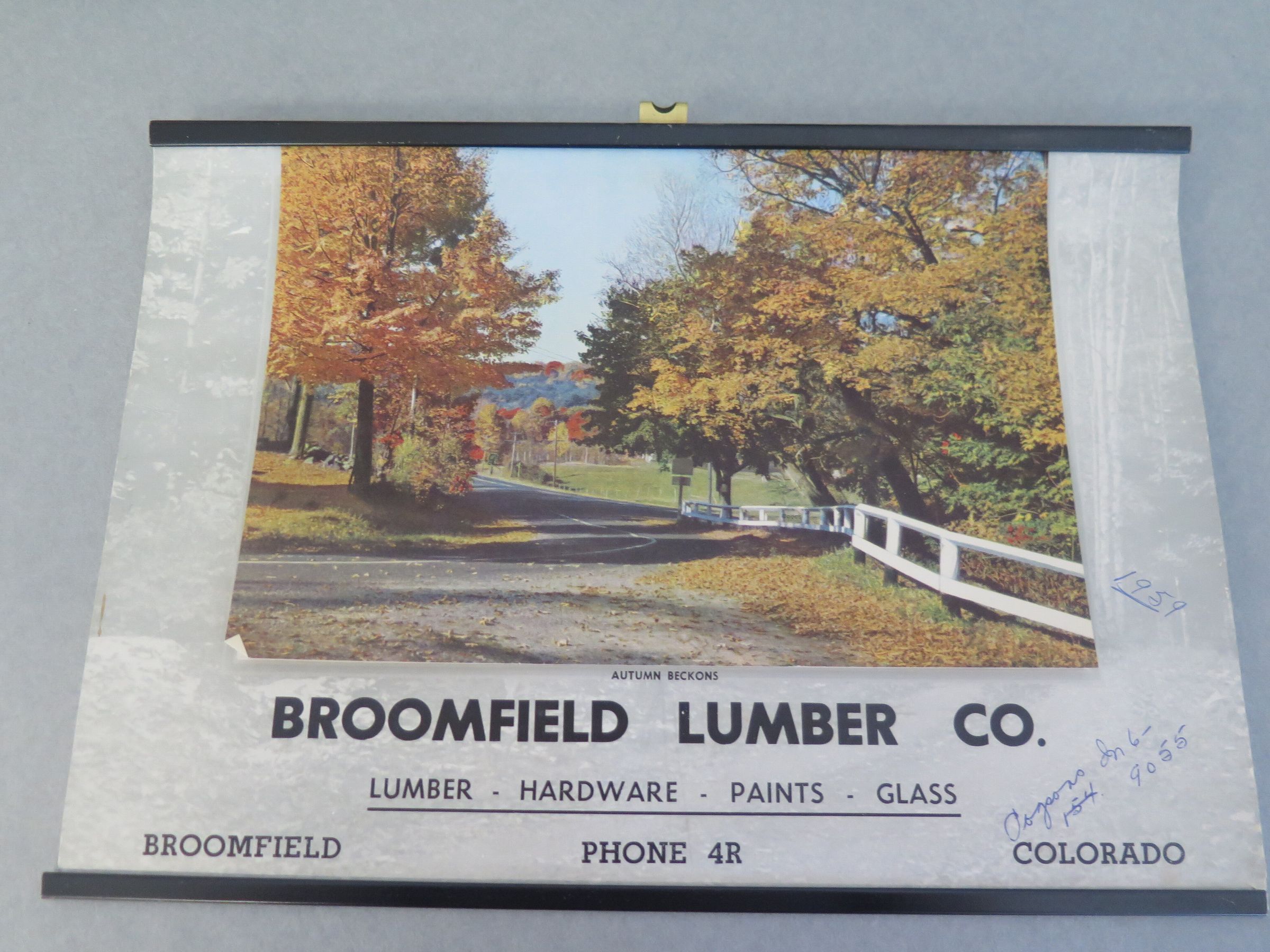 Broomfield Lumber Co. Calendar from 1959 with a photo captioned "Autumn Beckons" on the front.