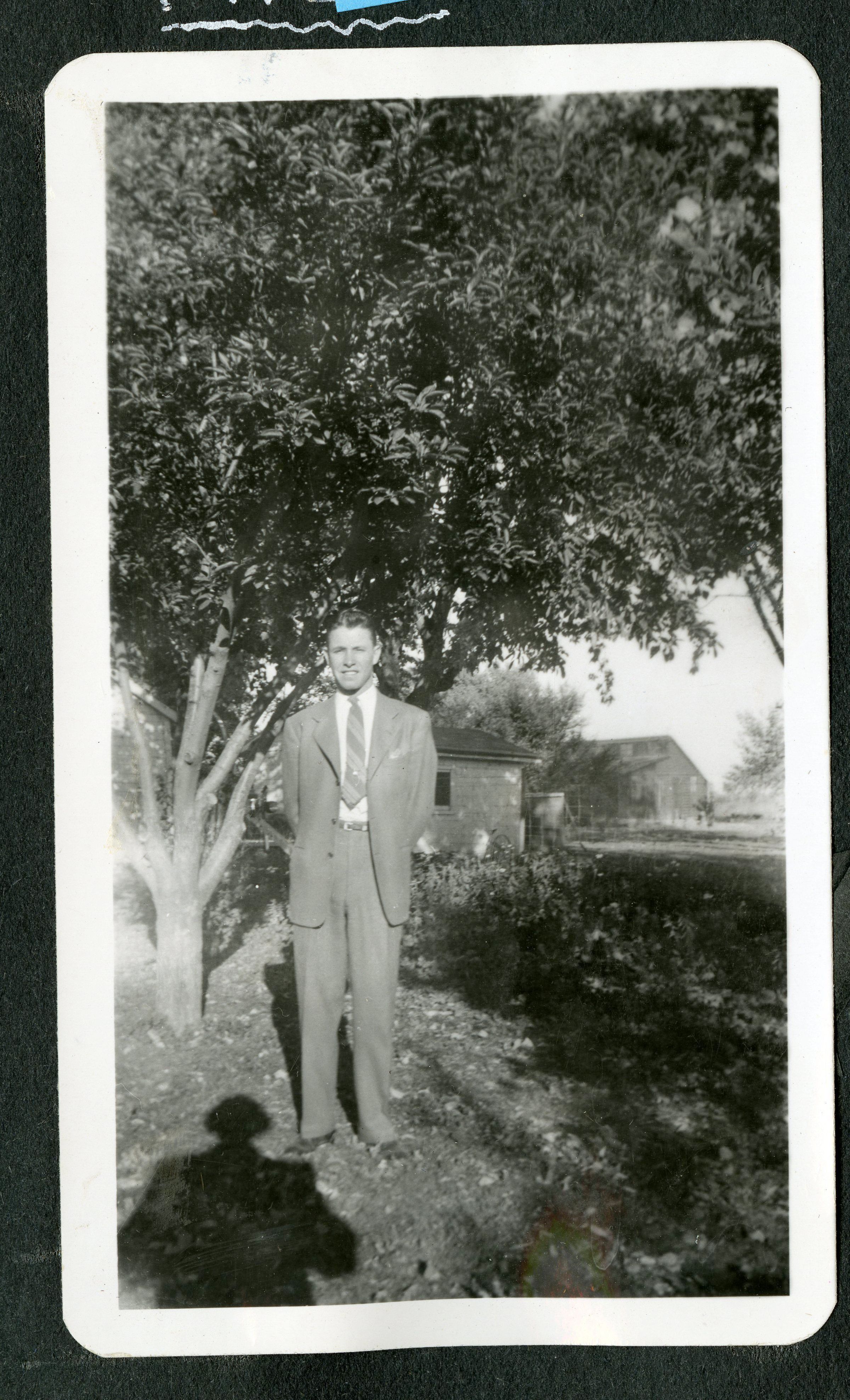 Black and white photograph of Clyde Brunner under a tree. Clyde Brunner was the state president of F.F.A. He resigned at the end of October to enter the armed forces. He left for Camp Peterson at Farragut, Ida on November second. Unsure of year but probably 1943 or 1944.