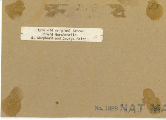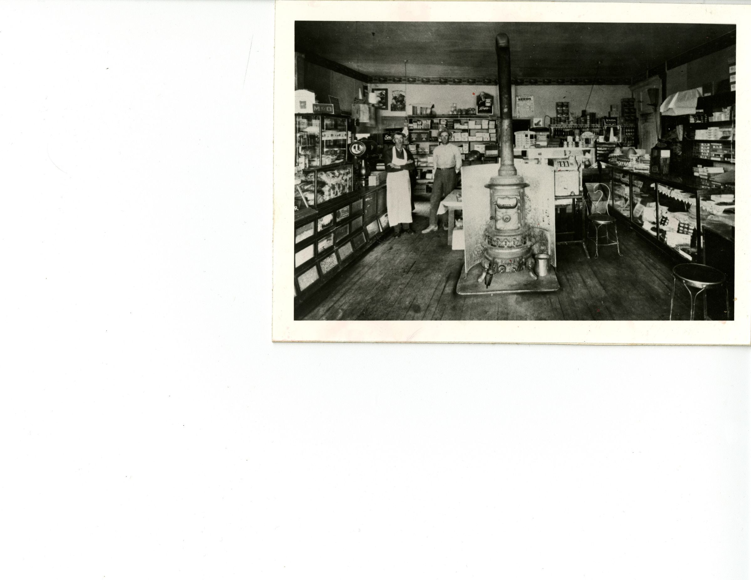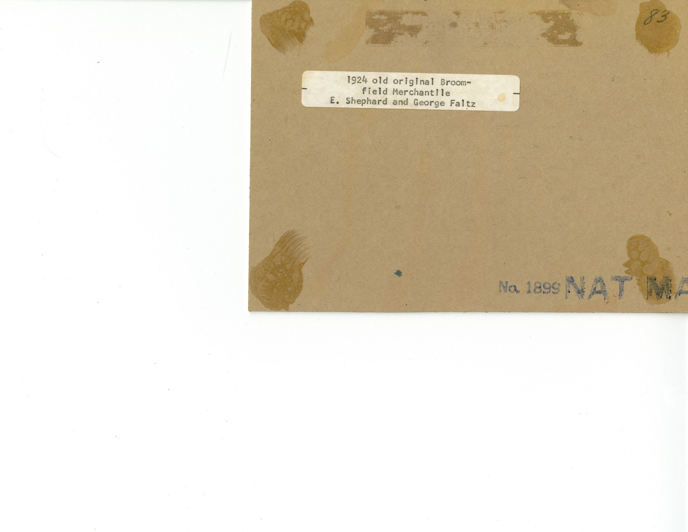 Broomfield Mercantile. Photo showing merchandise for sale, a wood stove, and E. Shepard and George Faltz standing next to merchanise counter.