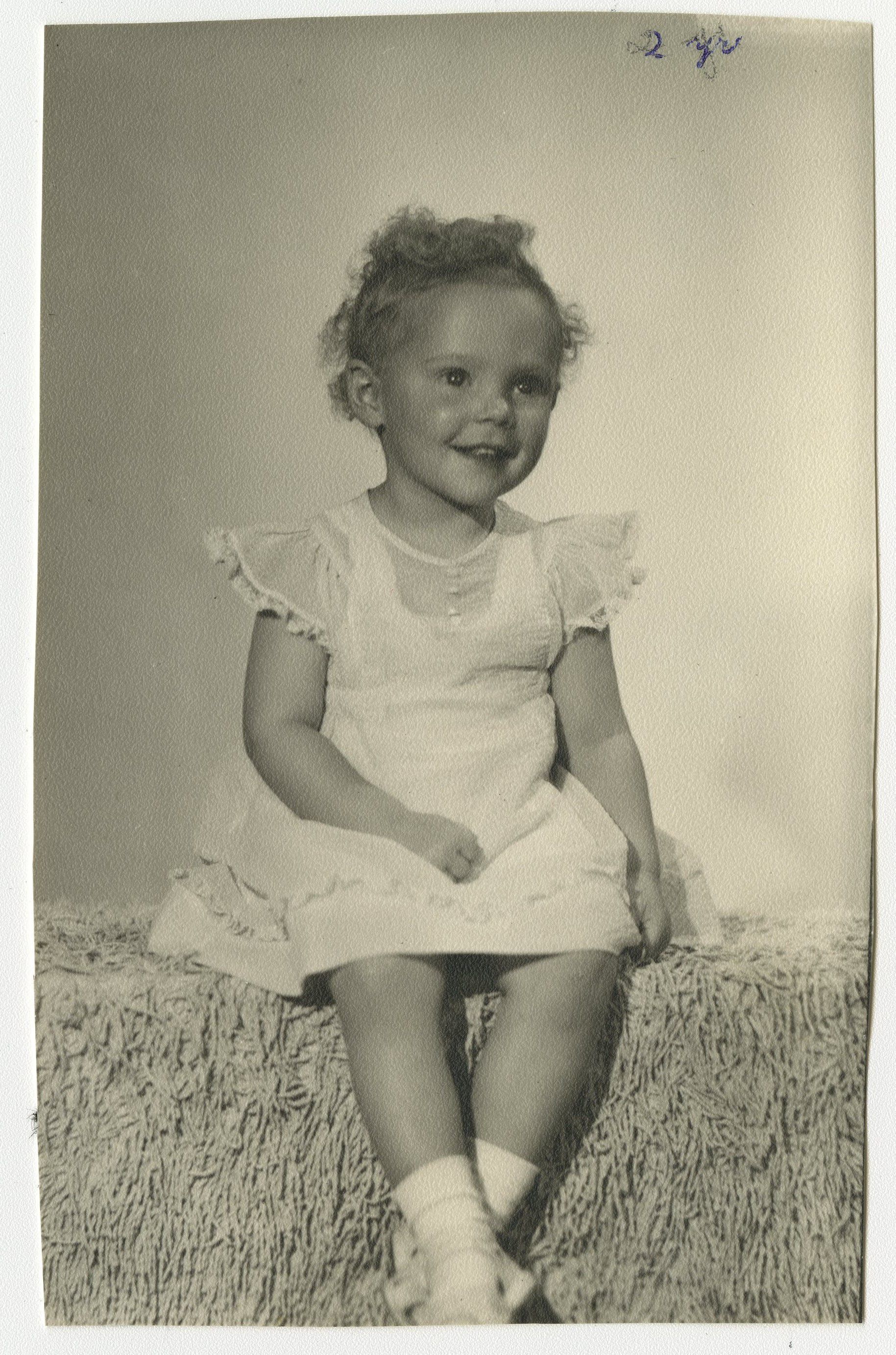 Black and white photograph of a child sitting on a fuzzy stool wearing a short white dress. Handwritten in ink in the top right corner " 2 yr".