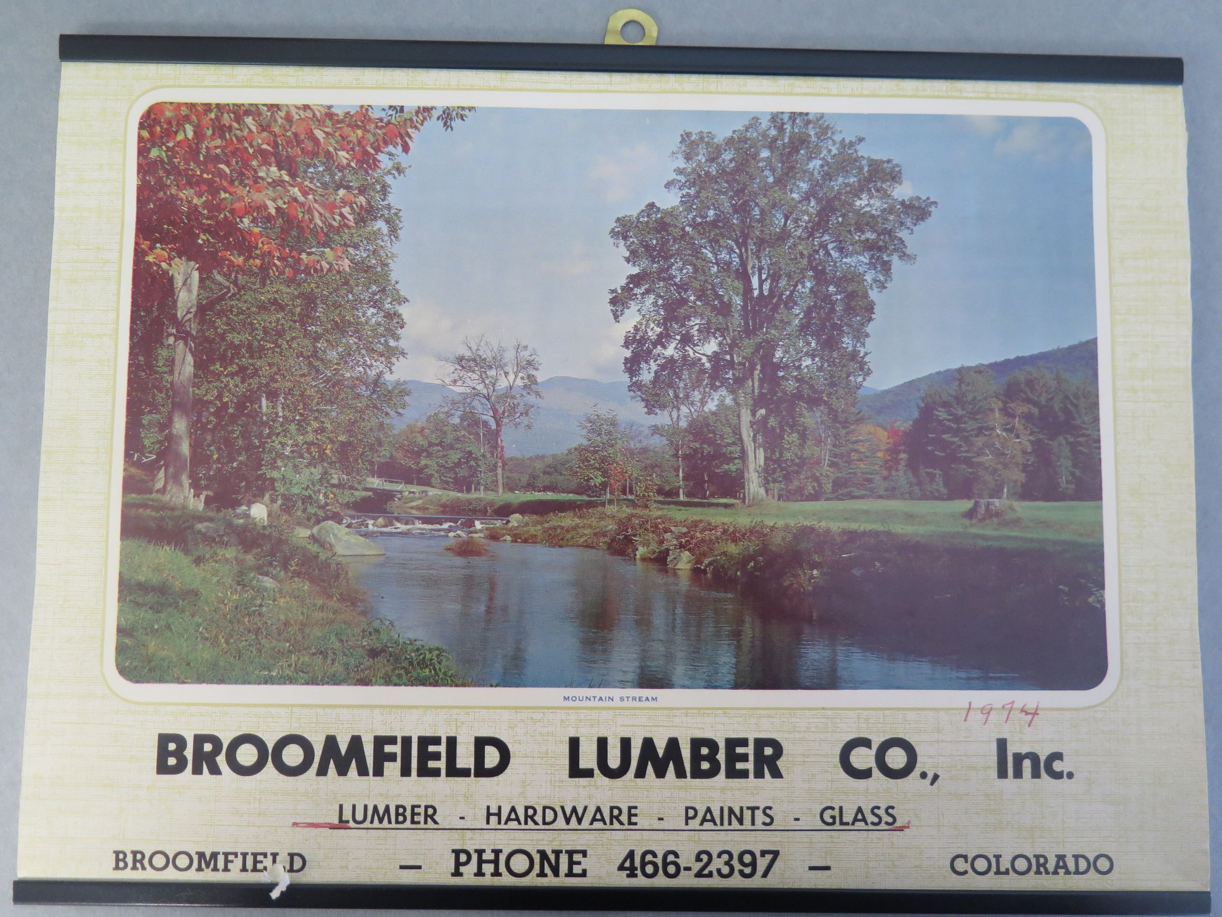 Broomfield Lumber Co. Calendar from 1974 with a photo captioned "Mountain Stream" on the front