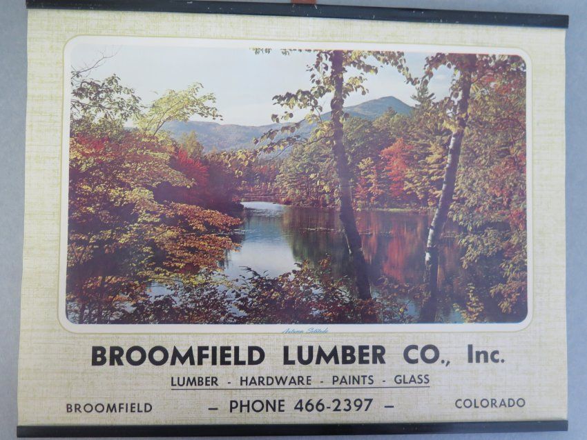 Broomfield Lumber Co. Calendar from 1975 with a photo captioned "Autumn Solitude" on the front. This is also the last calendar from this set, given the fact that Broomfield Lumber Co. does not exist in the present day, one may be able to assume that the company closed altogether sometime around 1975-1980.