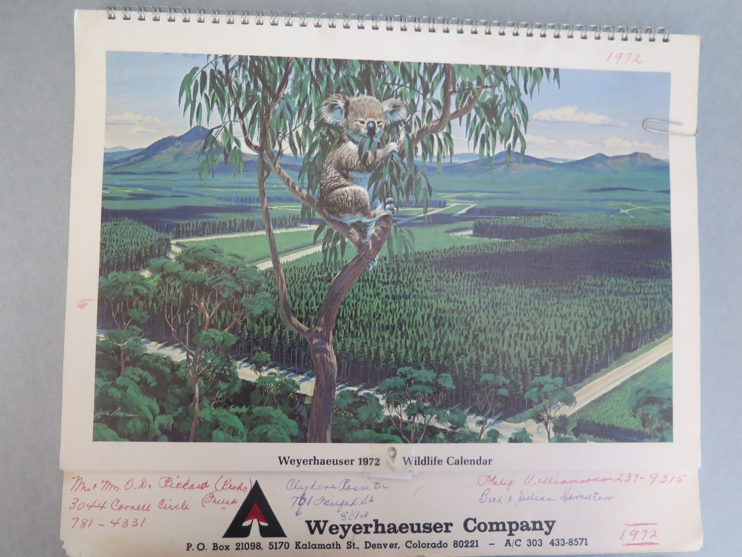 Calendar made by the Weyerhaeuser company, located on Kalamath St. Denver CO. It features a lumber and tree farm in the background with a koala eating some leaves high above the plantation.