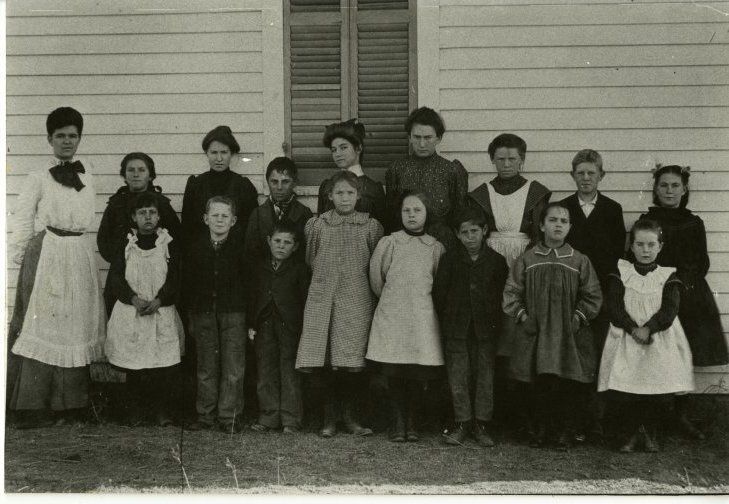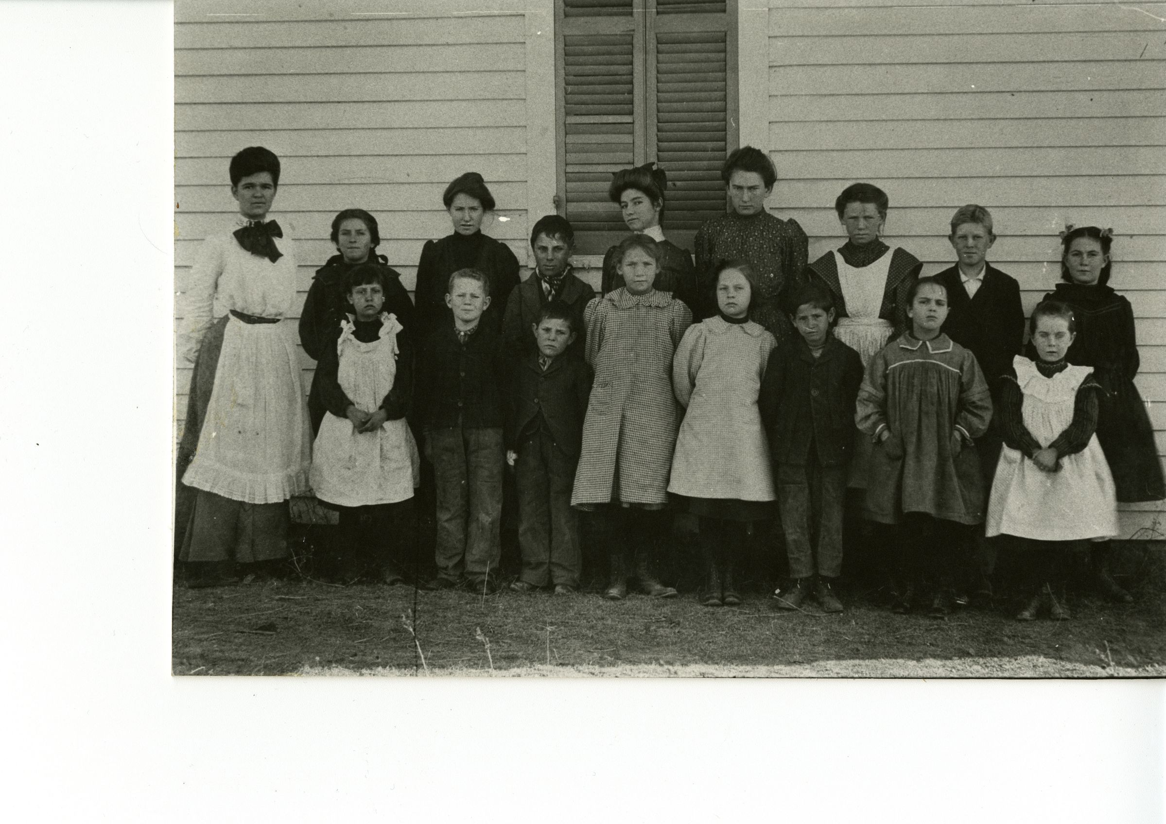 Black and white photograph of a female teacher and students of varying ages at the Lorraine School standing in front of a white painted building with shuttered window. The Lorraine School was built in 1885 to serve the students from northern Jefferson County and was named after a crossing stop built by the Denver and Interurban Electric Line. Reportedly, the Lorraine School/school building was moved in 1921 to 7898 119th Avenue, then in 1930, moved to 112th Avenue and Pierce Street. After the school closed, it was sold and moved to 11975 Vance Street. The building was torn down in 2012. The school was located on the corner of 112th and Pierce. It was taken around 1900.Collection
