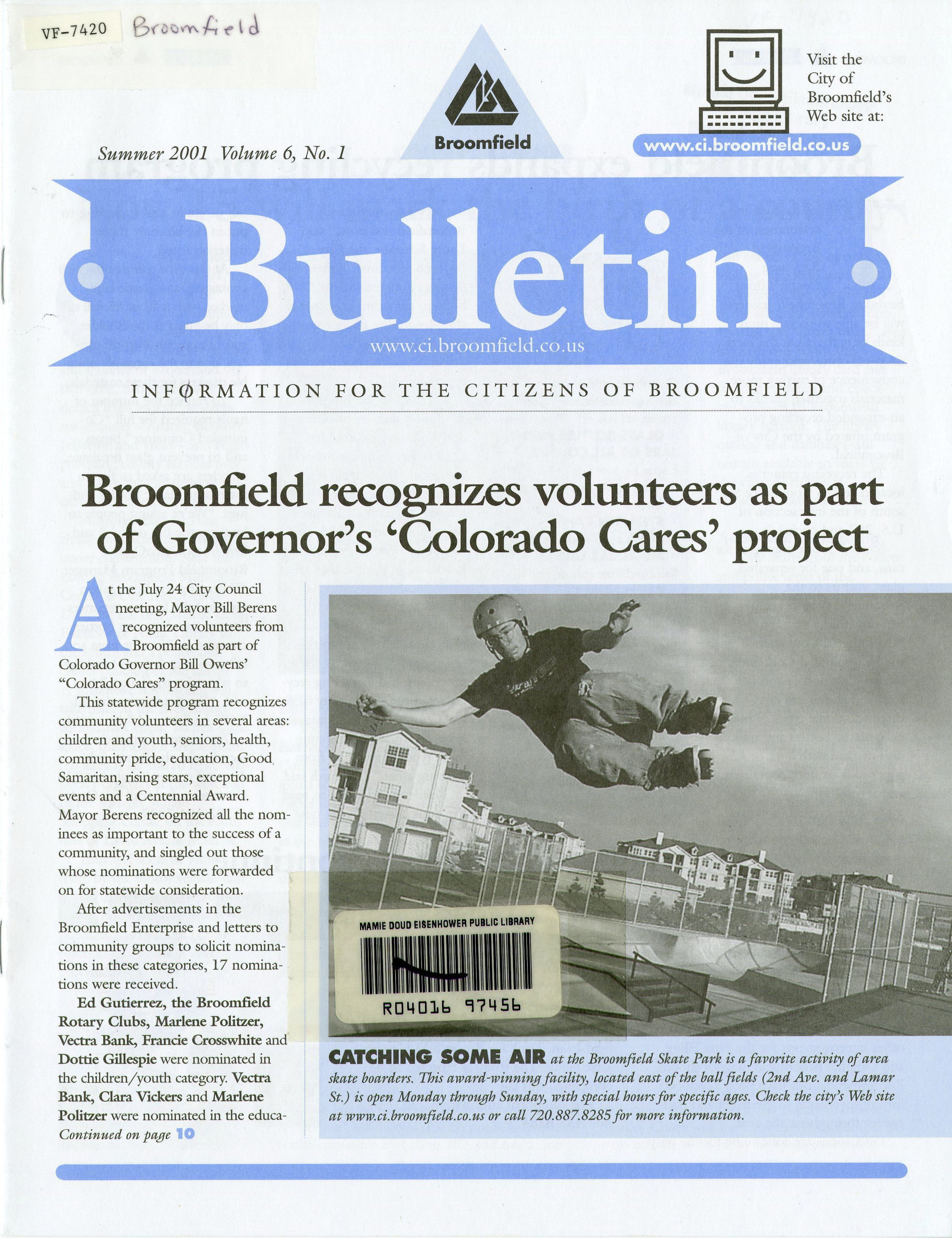 Volume 6 number 1 publication of Bulletin. Has sections on how Broomfield recognizes volunteers as part of Governor's 'Colorado Cares' project, the expanded recycling program, a reminder to check mail for election ballots, the City web site attracting over 225,000 visitors, the Adopt-a-Street/Park/Open space litter control program, and information on fluoride.Lexicon