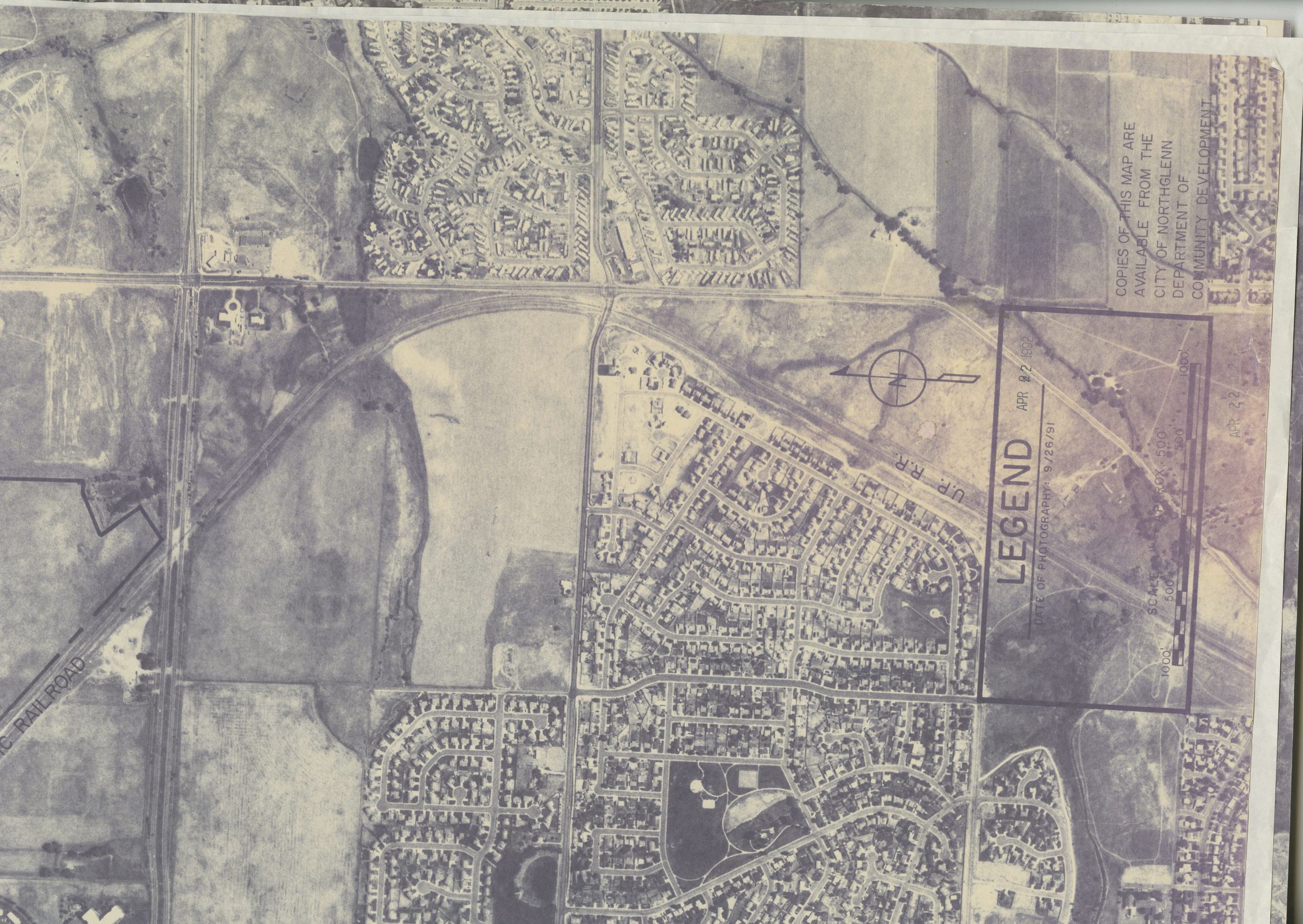 A piece of a Large Aerial photograph of Northglenn, CO, photographed on September 26, 1991, dated April 22, 1992, stamped next to the legend, on printer paper, covers suburban area and farmland.Photograph Details