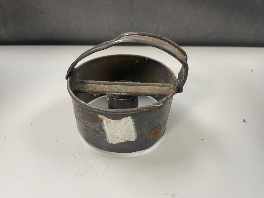 Metal Donut Cutter. Early 1920's-1950's. Small metal donut cutter to cut the dough-cutter has a round part in the middle to also cut the donut hole. Handle has had some damage. Doughnut cutter.