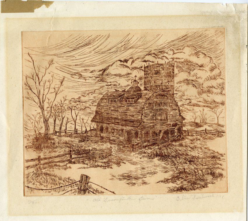 Intaglio print of Kozisek Barn, when it was still locatedlocated at what is now the northeast corner at Midway Blvd. and Main St. Print by Elise Beechwood in 1971.