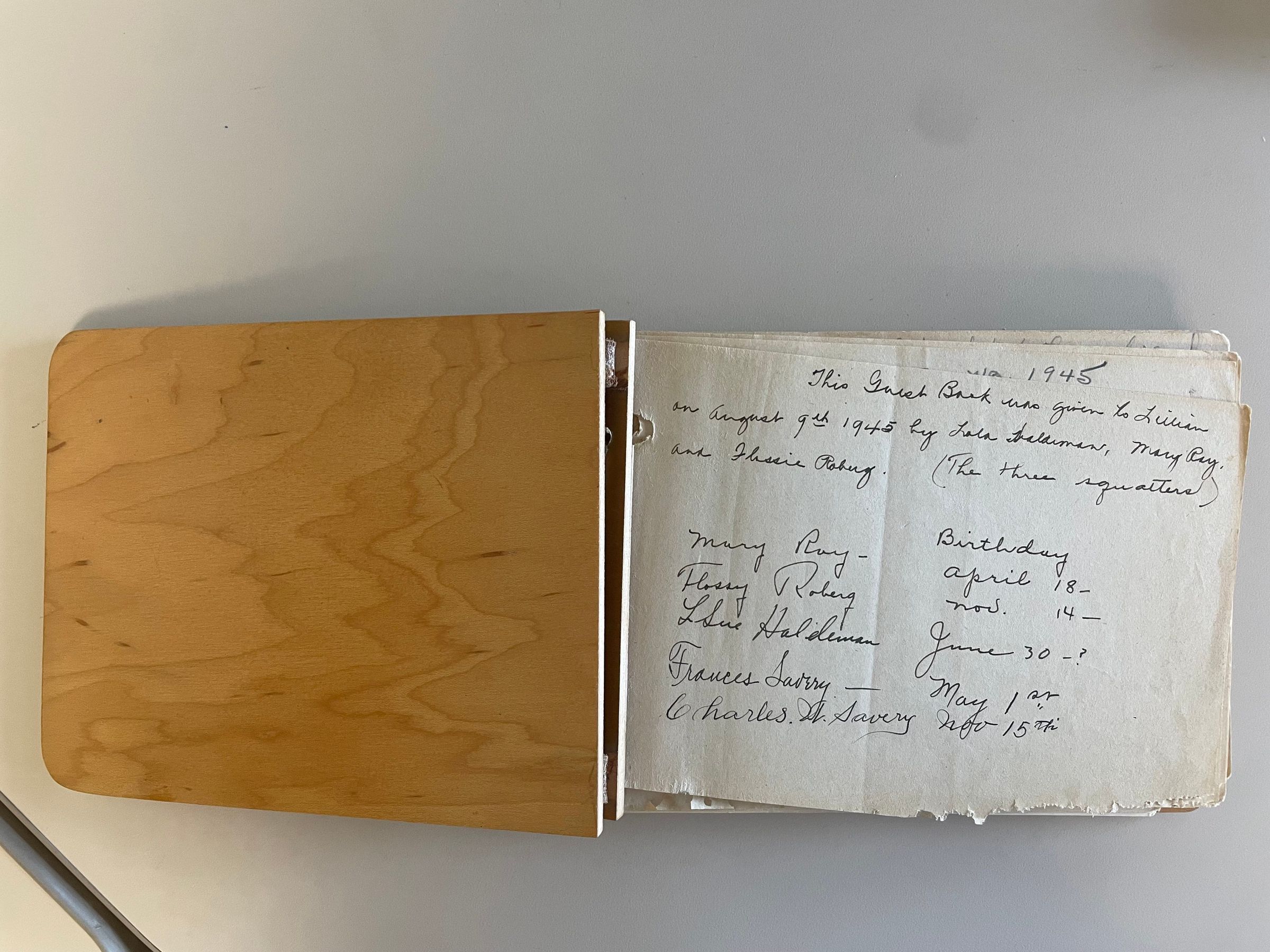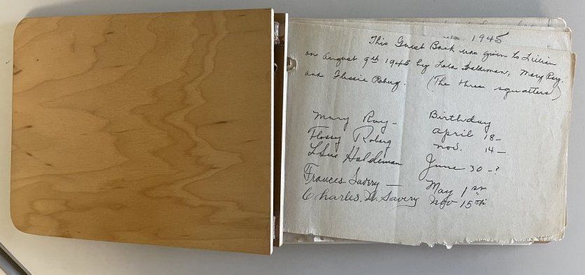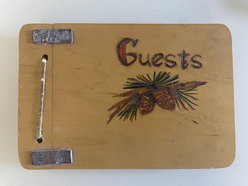 Book cover, front and back are made of wood held together with leather bindings. The front cover is engraved with the word "Guests" and acorns. Pages have names of guests, dates and comments.Collection