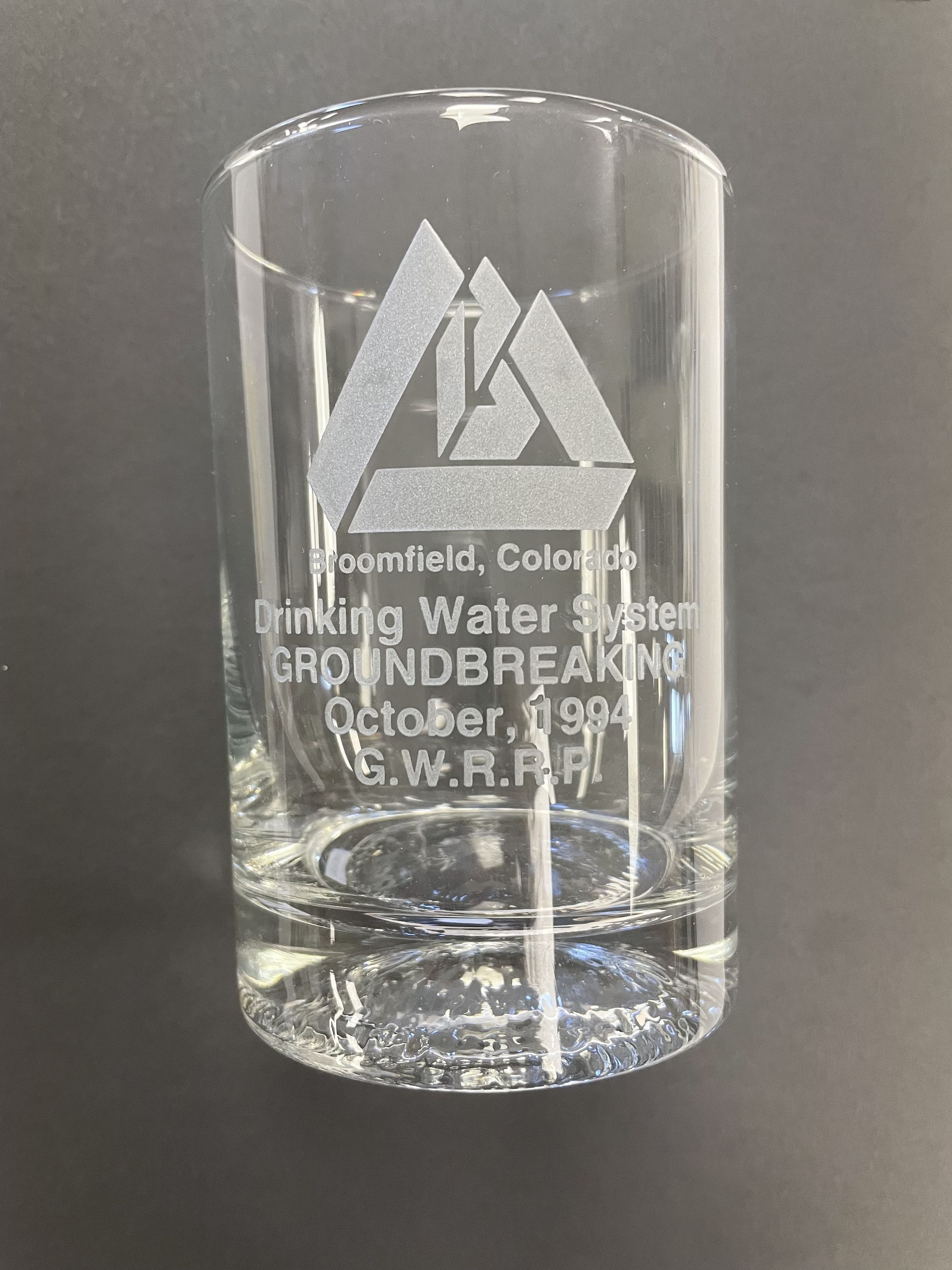 Clear water glass, heavy bottomed. "Drinking Water System. Ground Breaking. October 1994. G.W.R.R.P."