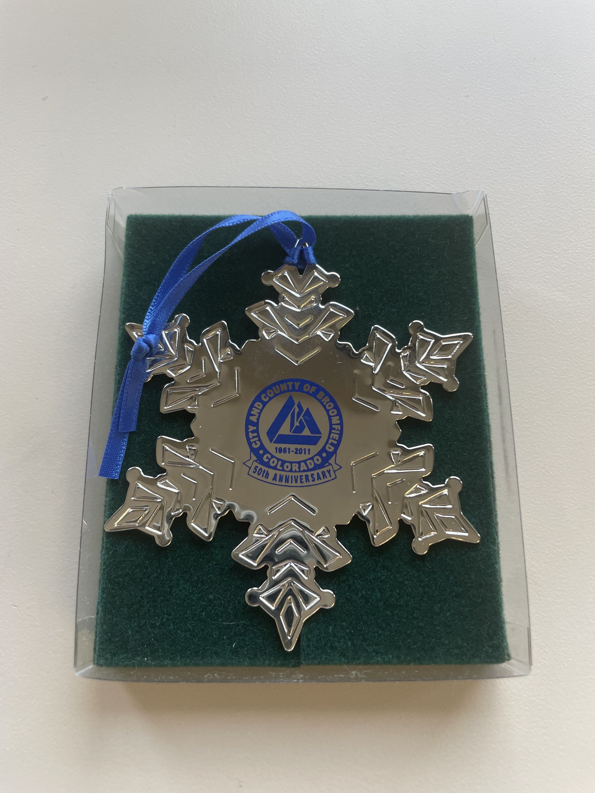 Commemorative Pewter/silver Christmas ornament / hanging pendent by Lindsay Claire. There is a blue ribbon attached to the pendant to hang it. Stamped on the pendant are the words "City and County of Broomfield Colorado. 50th Anniversary. 1961-2011". The city often gave ornaments to staff members during the holidays.
