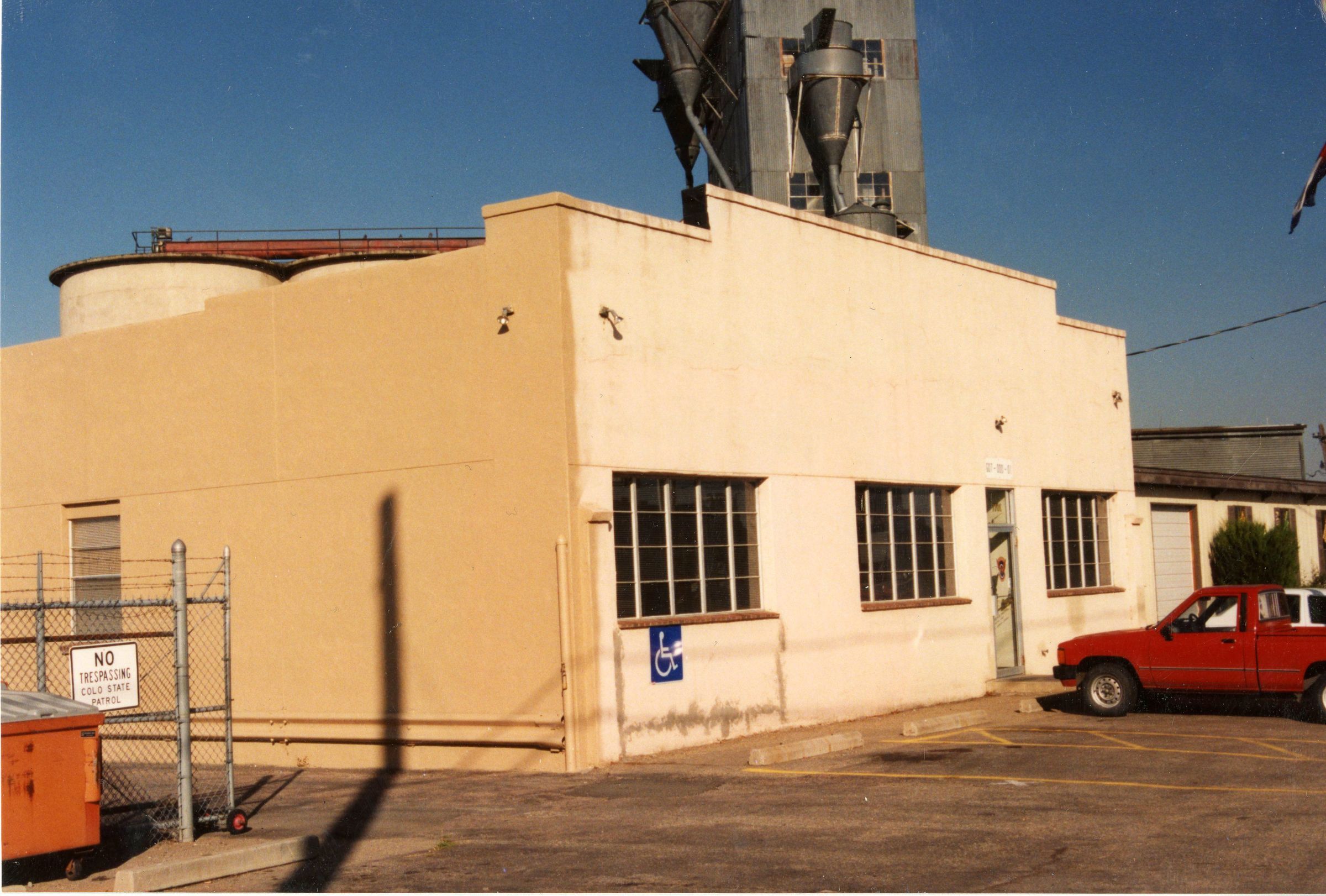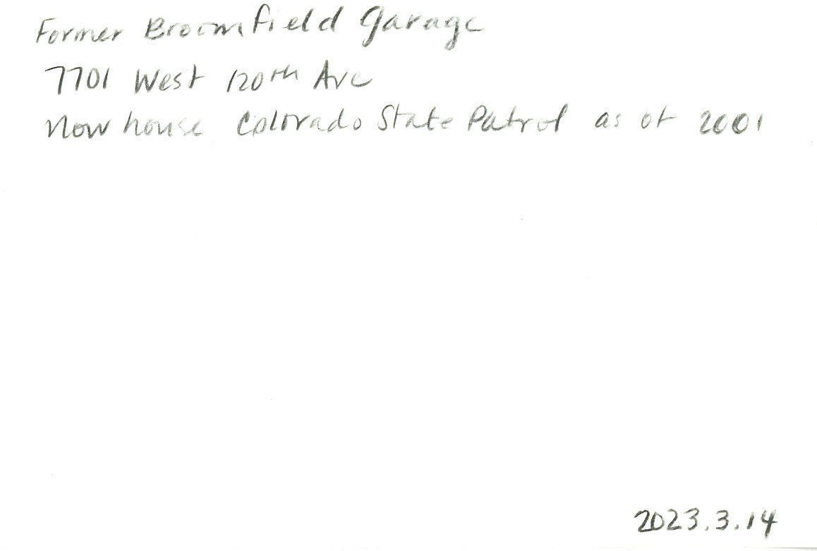 Color photo of the Colorado State Patrol building circa 1993. Building was formerly the Broomfield Garage, built in 1921. Located at 7701 West 120th Avenue. Building is beige stucco with 3 windows and a door on the front, one window on the side, flat roof. No landscaping, asphalt parking lot. Red truck in parking lot. Grain elevators can been seen in the background.