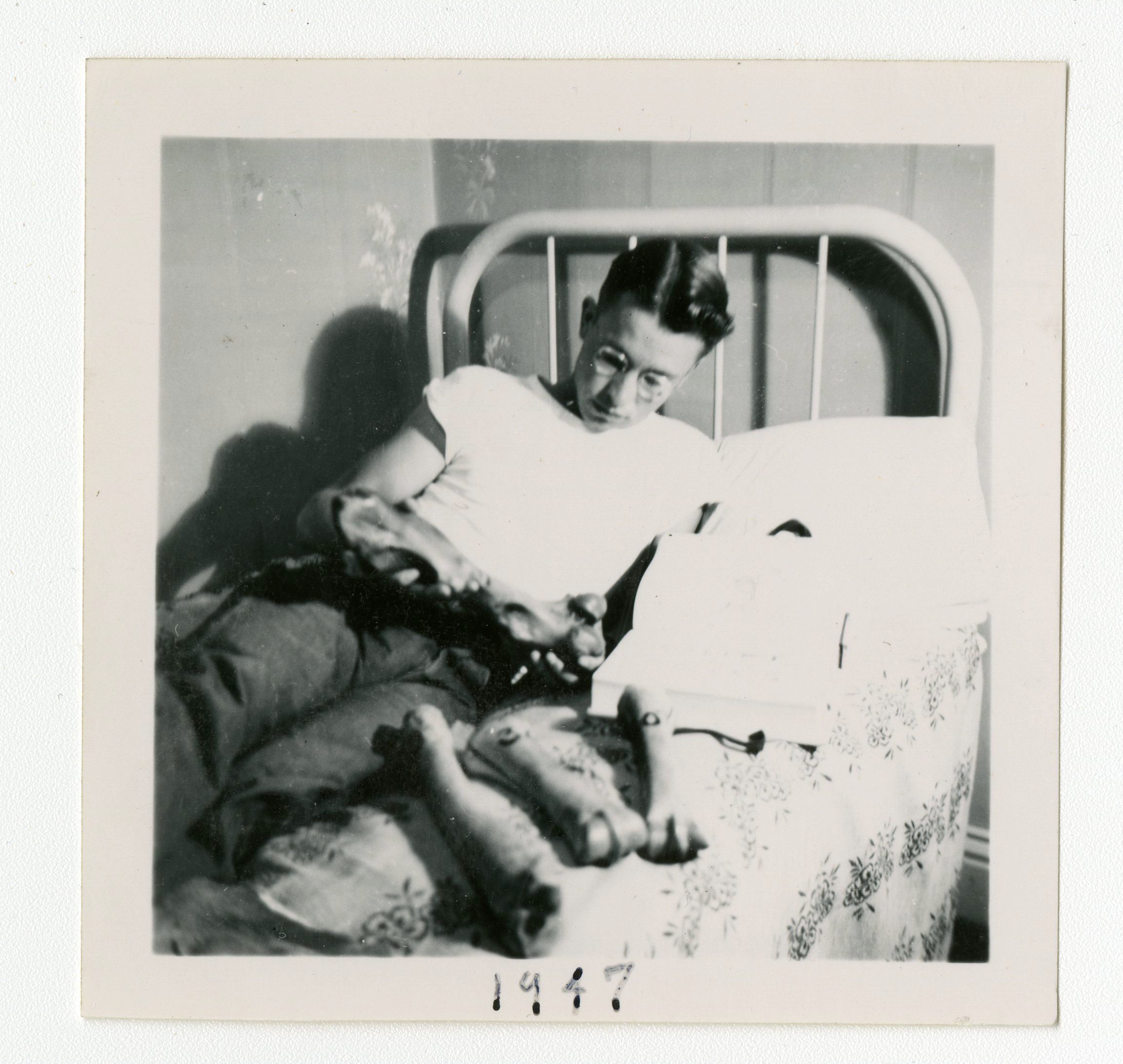 Black and white photograph of Clyde Brunner at school for veterinary medicine. Photograph taken during 1947.
