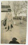 Black and white photograph of a man wearing a suit with matching pants, vest, and jacket. The suit is complete with a hat. Photograph was taken outside with a building in the background. The man is identified as Les. In the foreground is the shadow of a woman.