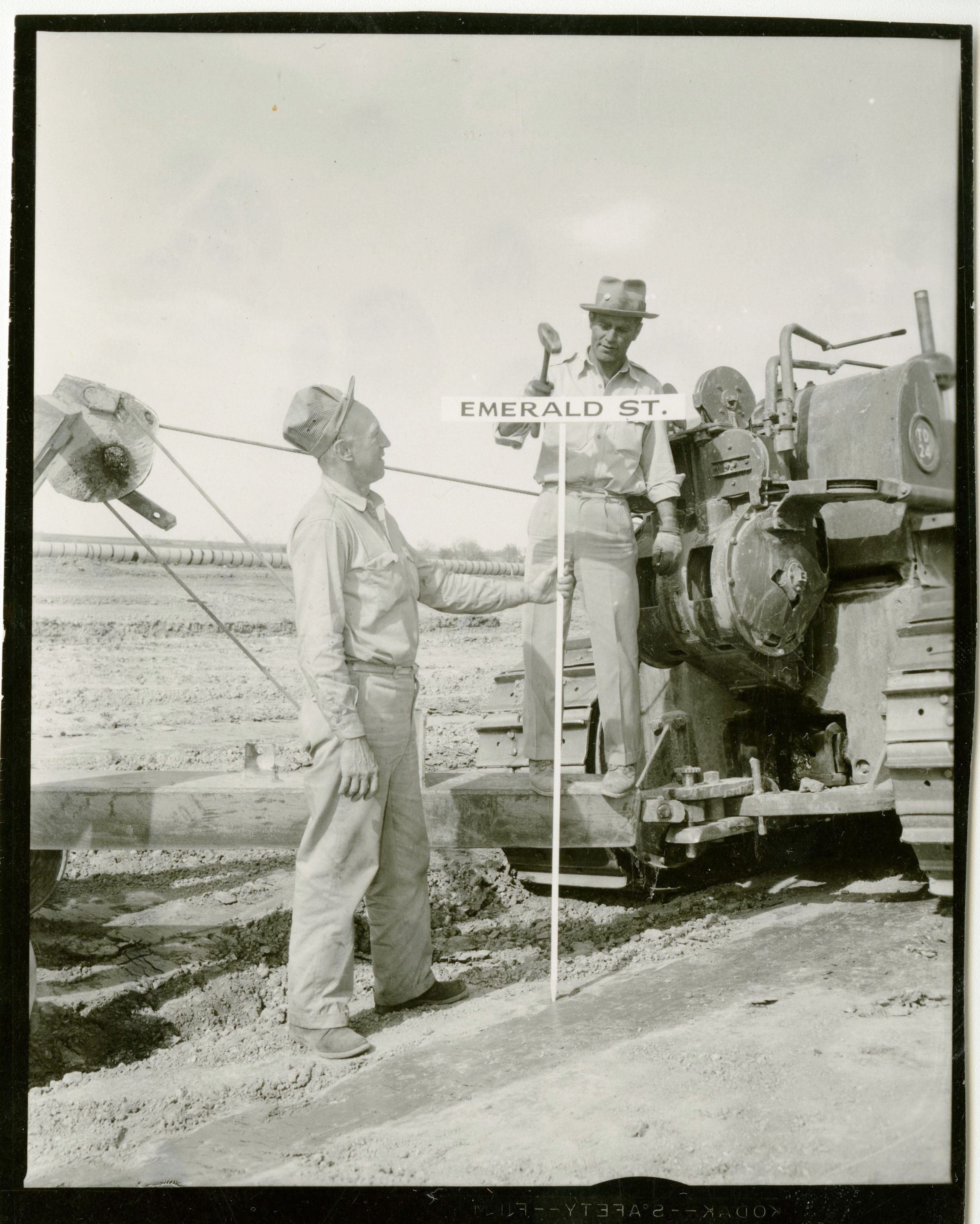 Item is the first photograph of a set of two black and white photographs. This picture features two men standing amidst some construction equipment. The first man is standing towards the left, holding in place a signpost that reads, "Emerald St." The other man is standing on the equipment, holding a hammer above the sign. It appears that he is hammering the post into the ground.Photograph Details