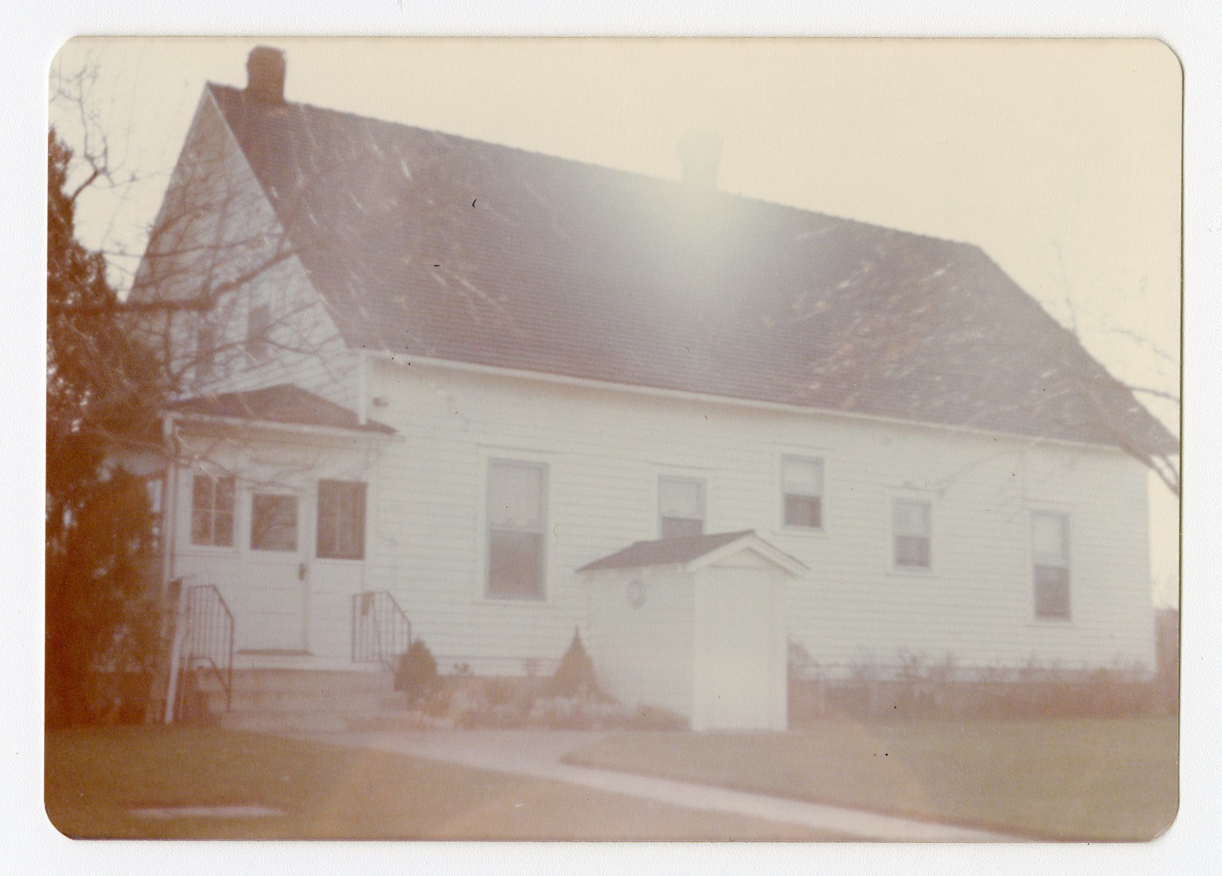 Color photograph of probably the Brunner Farmhouse taken in the fall of 1980. Shows the side of the house with a door and small porch on the left.