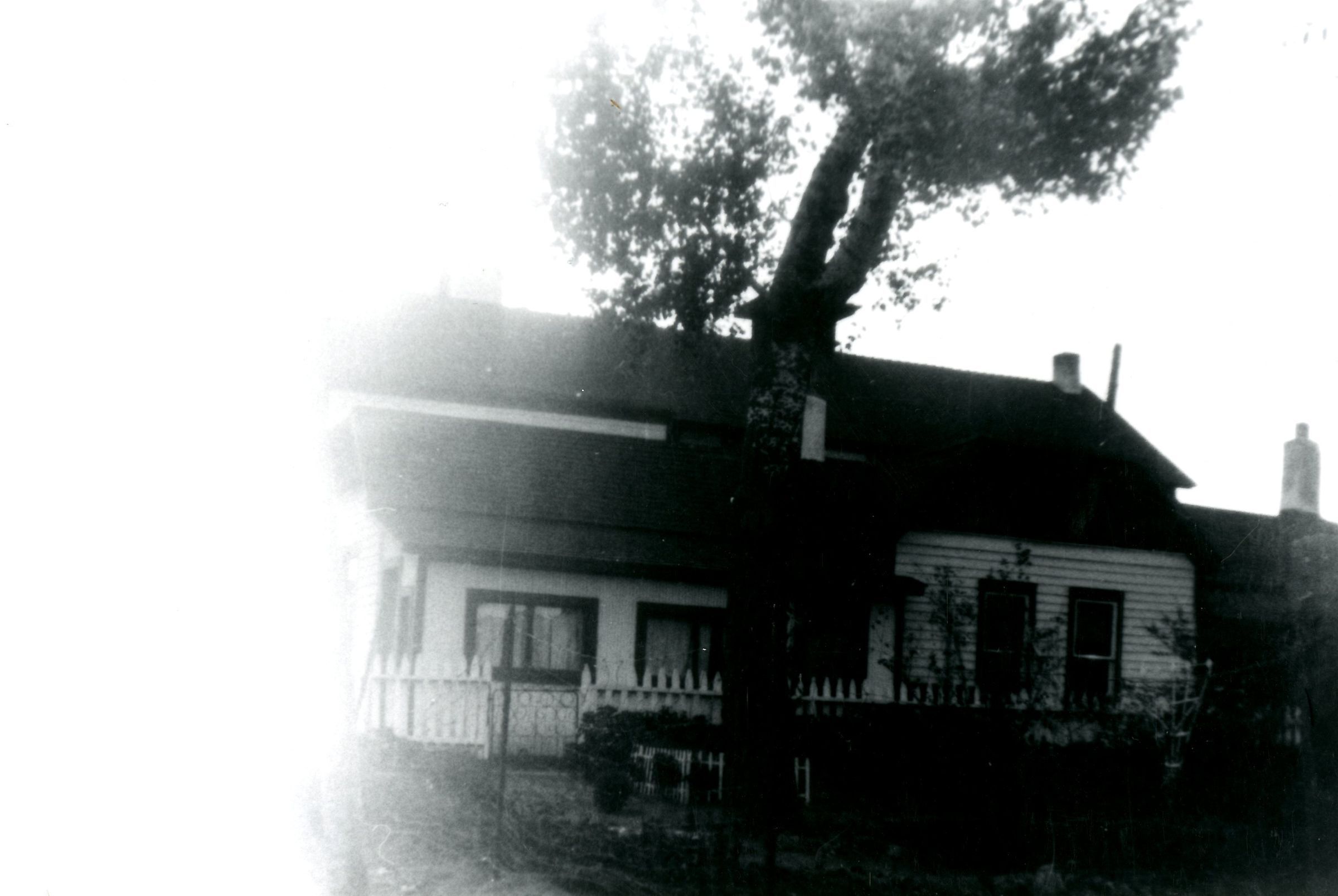 Photograph, Black and White, House connected to Jones Hall, Tree in front of house, white short fence bordering yard. Flowers along fence