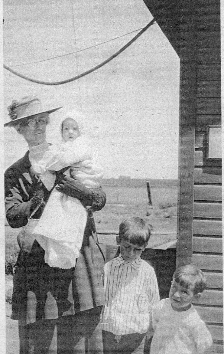 Burns Junction Station Agent's mother and children. Taken at Burns Junction Depot. Left to Right: Mother of Agent, Alice Shunk (Kingston), Agent's daughter, Mildred J. (Maki), and sons, Charles F. Jr, and Harry M. Shunk.Collection