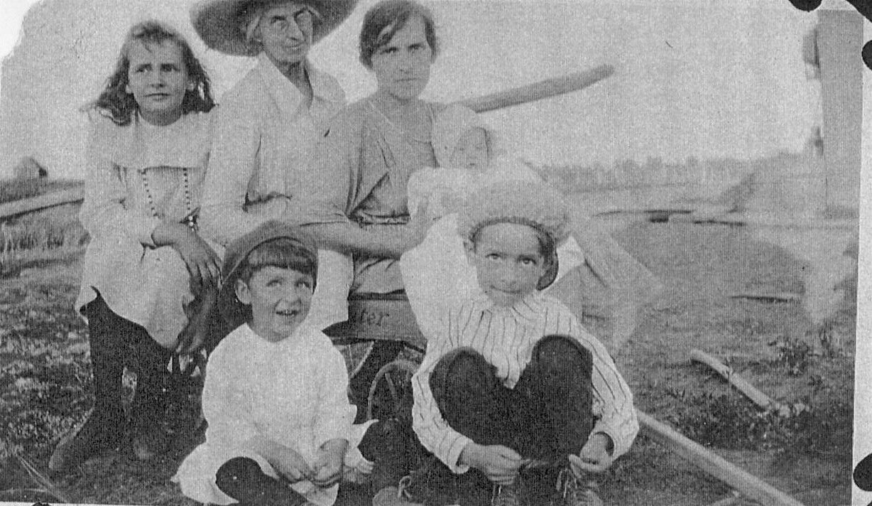 Burns Junction Station Agent's Family near Broomfield Grain Elevator sitting on child's wagon. Left to Right: Daughter, Cecelia T. Shunk (Weller), mother, Alice (Kingston), wife, Hazel M. (Franks), sons, Harry M. and Charles F. Shunk, Jr.Collection