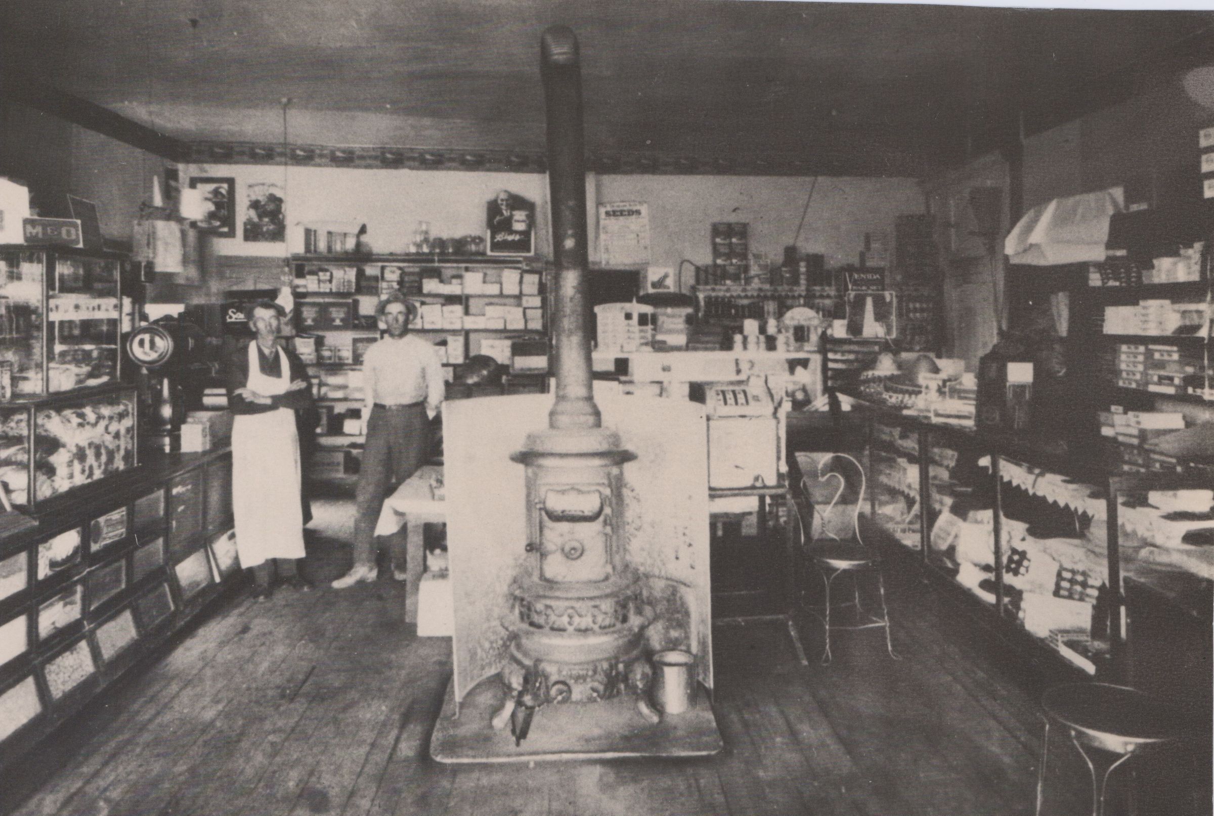 1924 Interior of the Old Original Broomfielld Mercantile, two men standing and identified as E. Shepard and George Faltz. Inside of a dry goods store with elaborate coal stove at center. Shelves and glass cabinaets filled with goods.