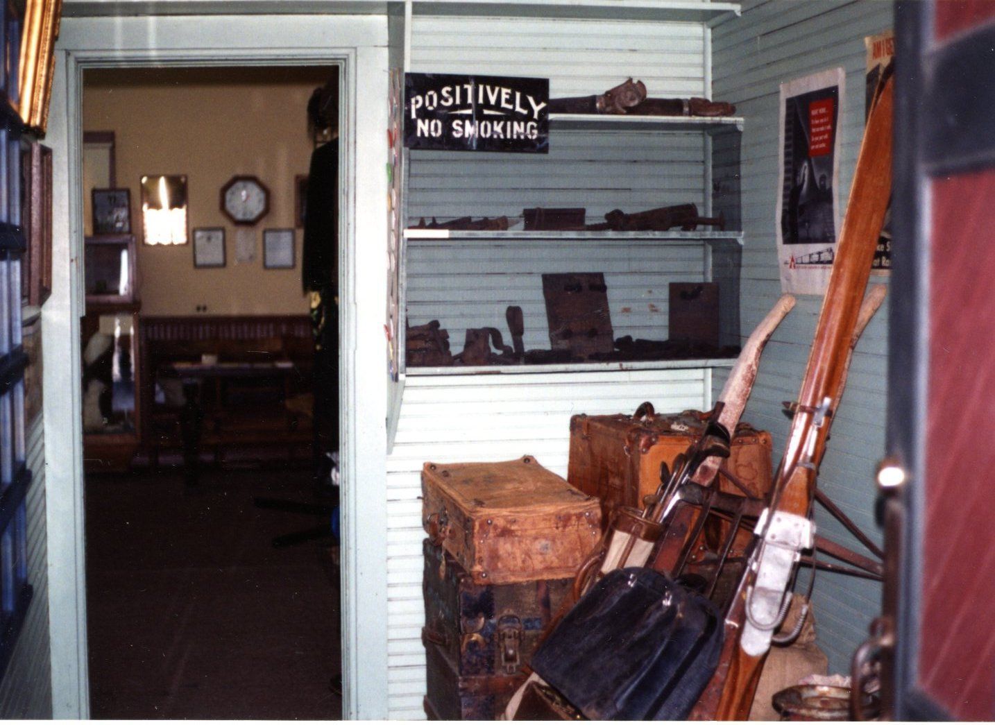 Photo of interior of the Depot Museum, c. early 1990s. Luggage room showing door on left and luggage and cart on right. Positively no smoking sign.