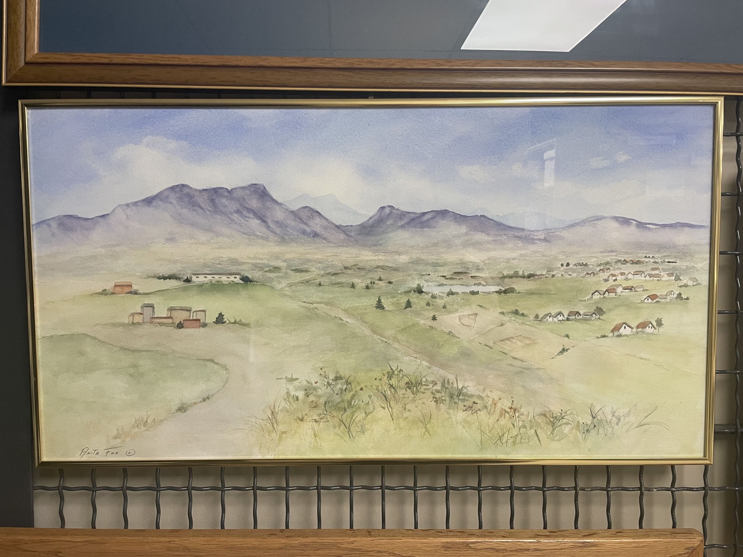 Framed watercolor painting of what appears to be Broomfield looking west towards the mountains in the background. The foreground is prairie and there is a smattering of houses and buildings throughout th emiddle ground.Collection