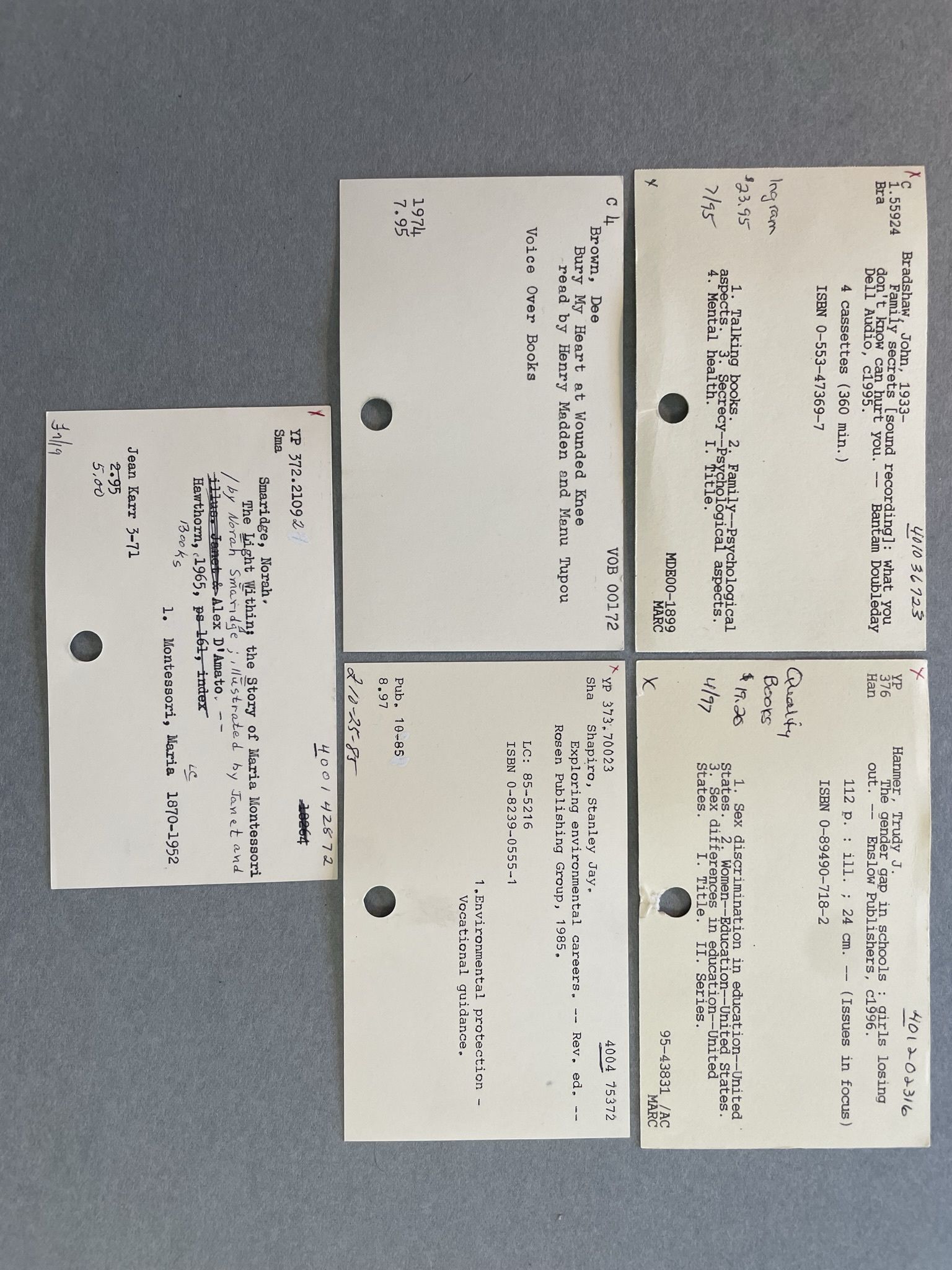 Five library catalog cards from the old Mamie Doud Eisenhower Card Catalog. These were taken out of teh wooden card catalog that was still at the library in 2022. It was emptied to become the library's new Seed Library with CSU Extension. Cards are cream-colored (possibly yellowed) with holes at the bottom edge where they woud have been attached to the drawer of the card catalog. Cards give info such as author, title, ISBN, call number, subject matter, and even the purchase price of the book.