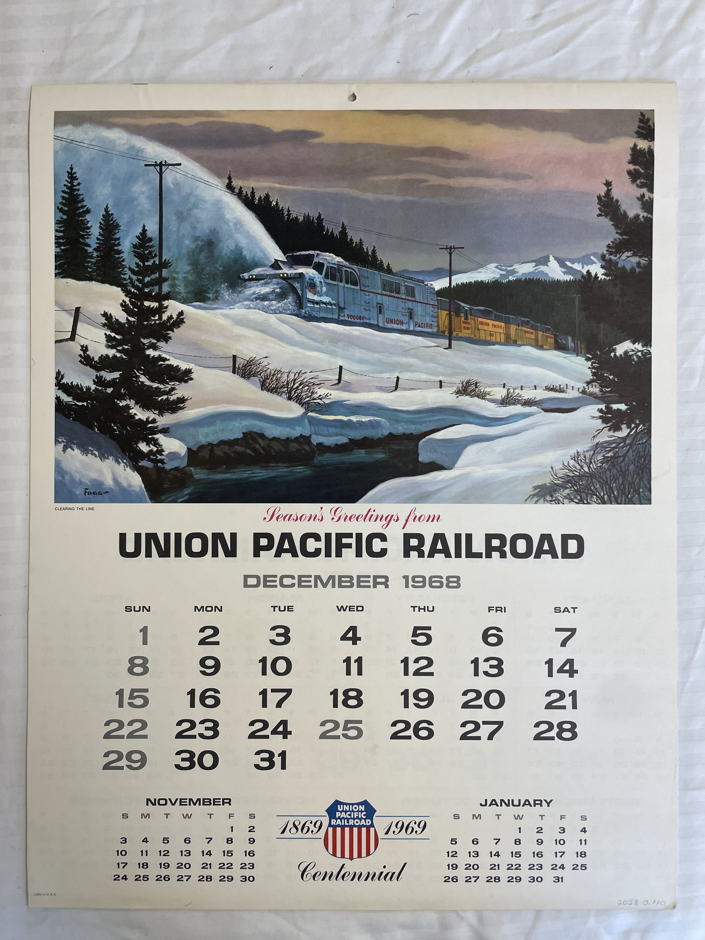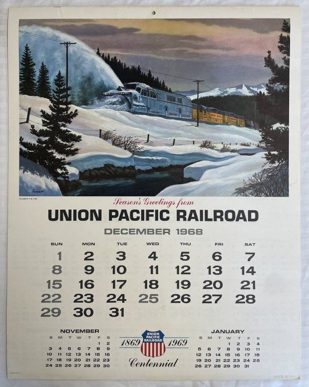 A calendar with various paintings of trains set in differnet seasons for every month. They were all painted by a man with the last name of Fogg. The calendar was for the year 1968Collection