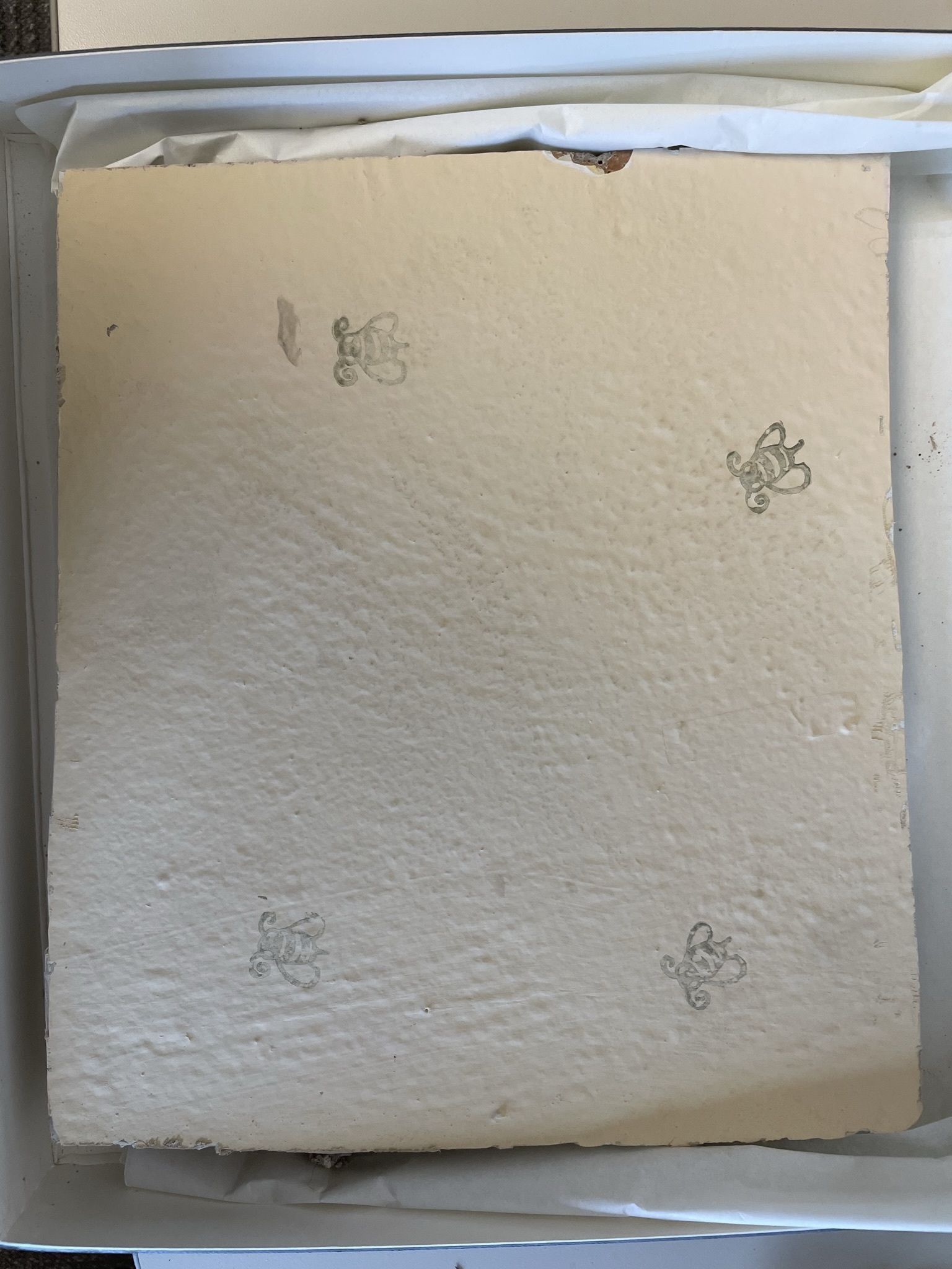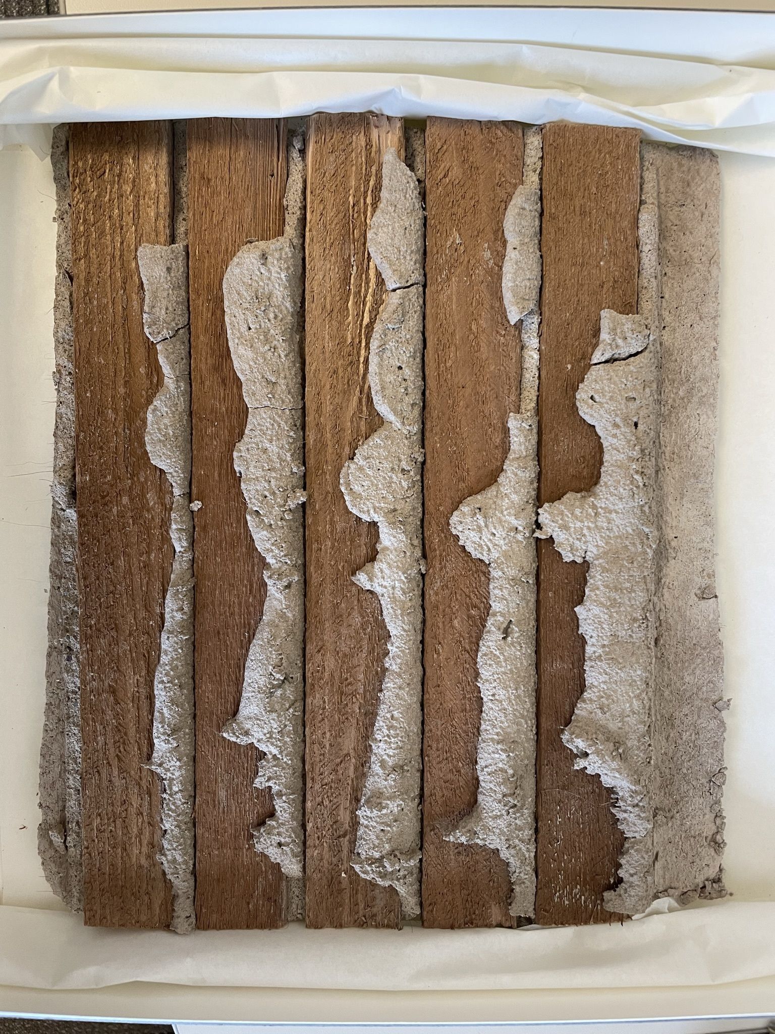 Piece/fragment of original wall from Honey House. Backside shows the lath and plaster contsruction popular at the time and before the introduction of drywall. The opposite side shows the walls as they existed before renovation began, painted a light yellow and stamped with bees in black ink, likely done in the late 1990. This piece was saved by the construction crew doing the Honey House renovations in May 2022.