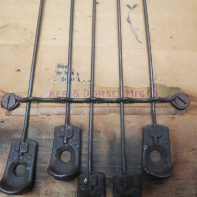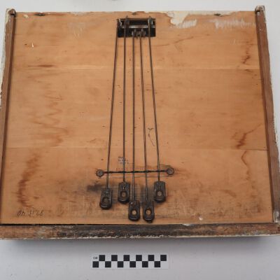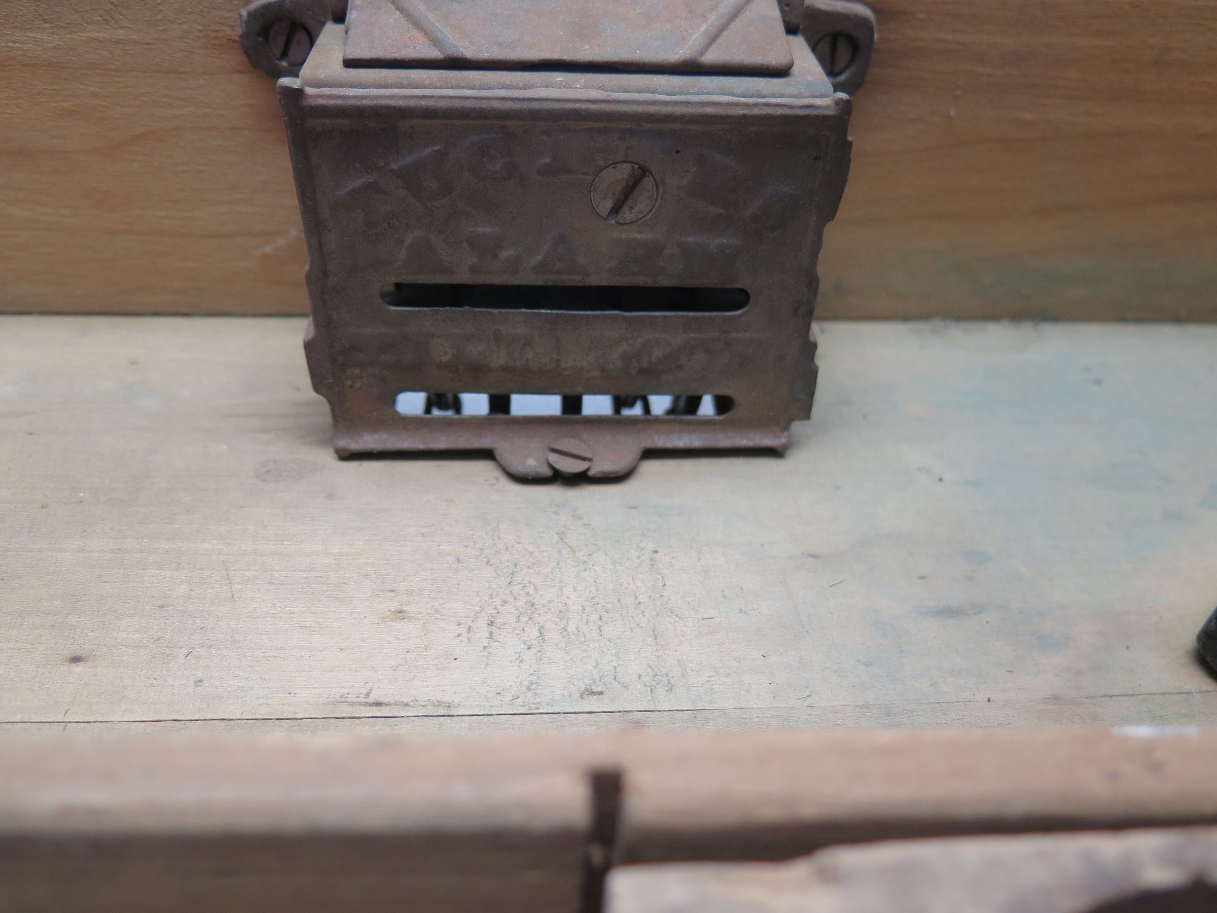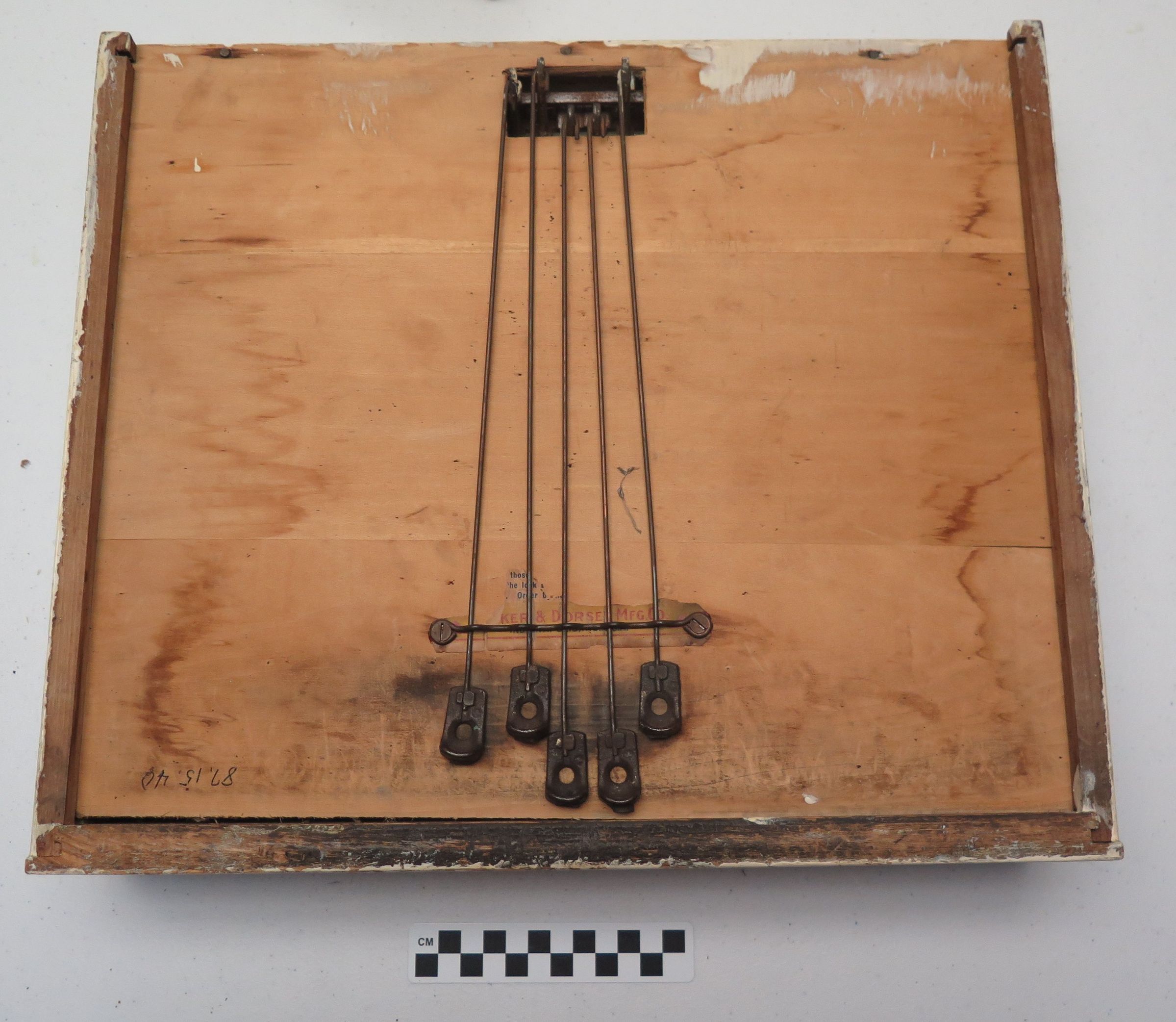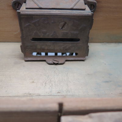 Tucker's brand alarm till, a cash register drawer. The 16.5"(l) x 4.5"(h) x 14"(d) drawer is missing the top, which would have been screwed to the underside of a counter. The mechanism inside the drawer, "Tucker's Alarm Till Lock," rings a bell whenever the drawer is pulled out. On the underside of the drawer are five wires with tips connected to the alarm. The shopkeeper could disable the alarm by pulling the right combination of wires. There is one nonremovable coin tray with two compartments in the drawer.