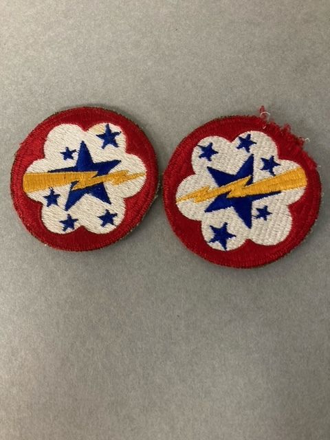 Two US military patches with a yellow lighting bolt and five blue stars with a white background and red edging. Army Service Forces. Represents US Forces in the Western Pacific. Likely WWII and owned by John T. Huddart