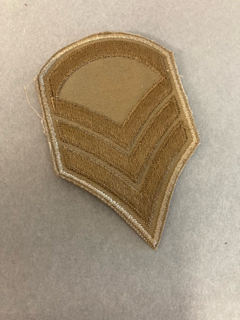US Army Staff Sargent Rank military arm patch. 3 light green stipes and a half circle on a khaki background. Likely WWII and owned by John T. Huddart.