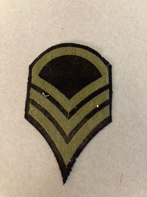 US Army Staff Sargent Rank military arm patch. Three olive green stipes and a half circle on a black background. Likely WWII and owned by John T. Huddart.