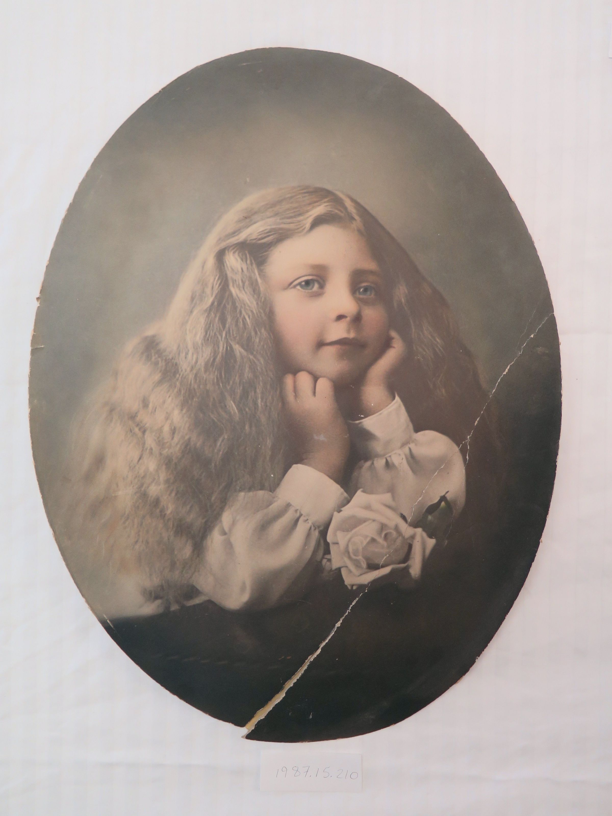 Bust portrait of a young blonde, blue-eyed girl with long hair. Oval convex hand-colored photo on cardboard.Collection
