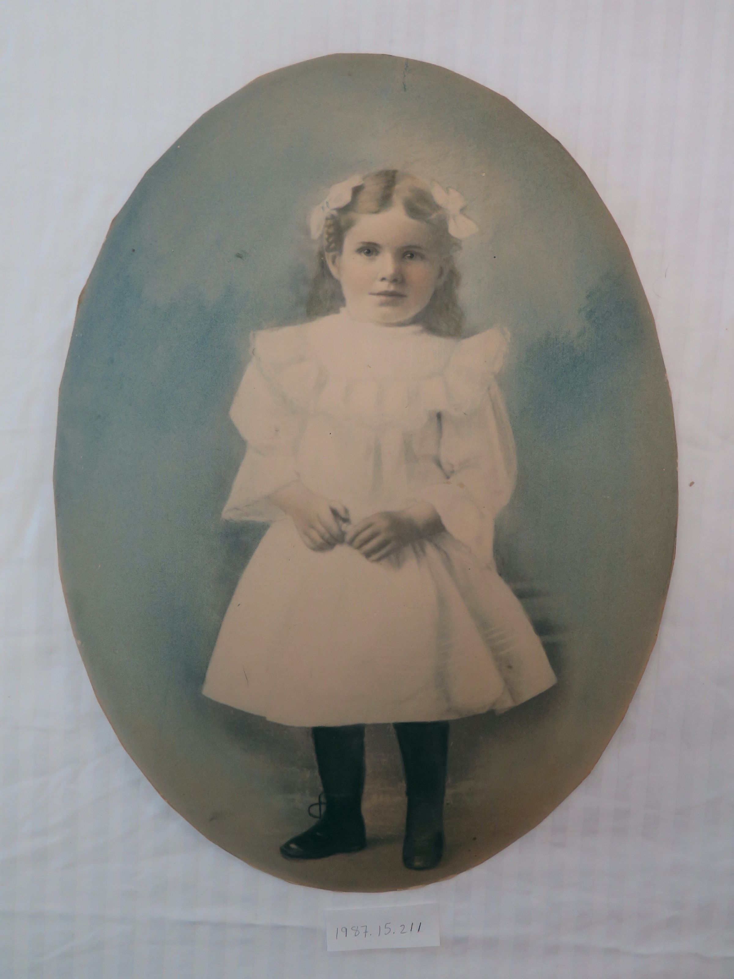 A young girl aged 6-8 years old stands in a white dress, black stockings and black shoes. She holds some unknown object in her hands. She has blue eyes and blonde hair held half-up with two white bows. The portrait is an oval convex photo on cardboard that has been hand colored. Back has written "Dora Crawford - Broomfield."Collection