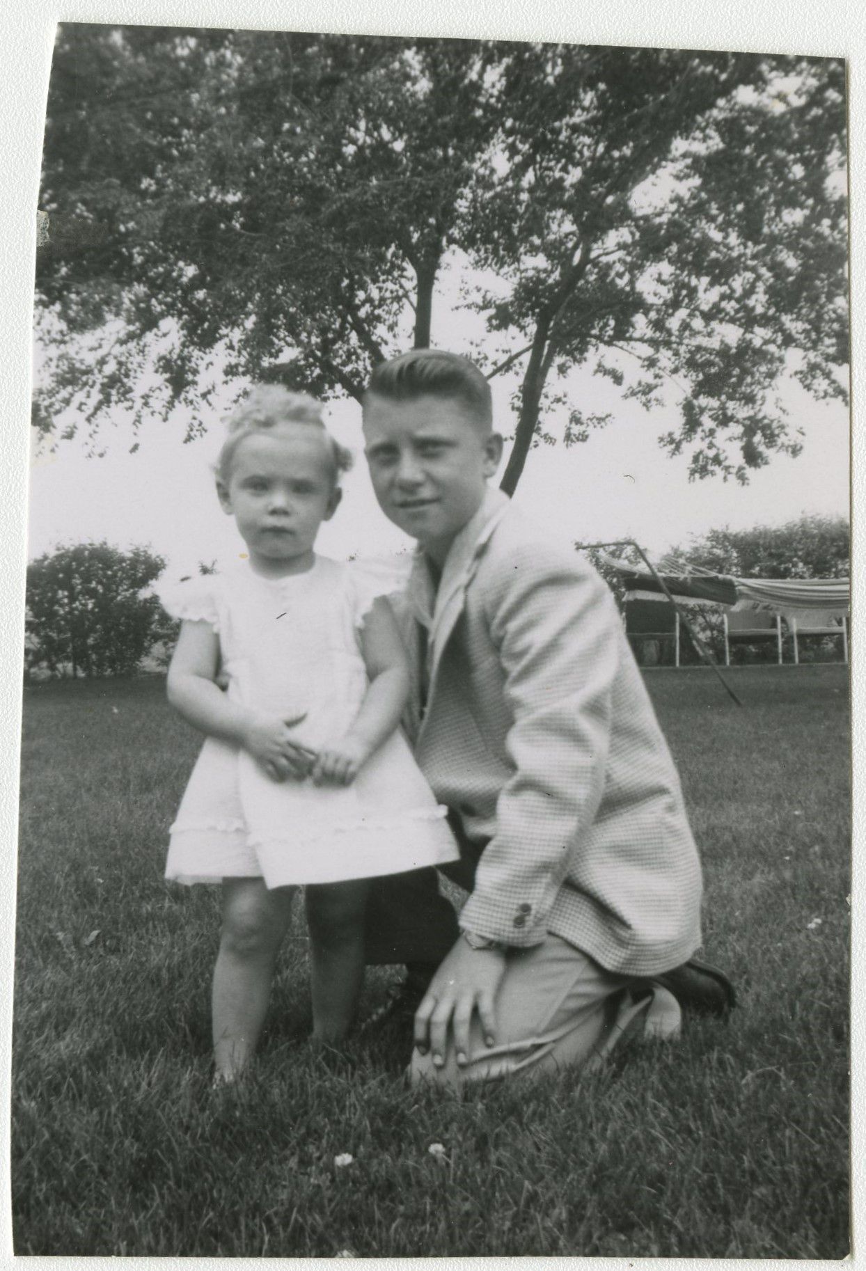Black and white photograph of a boy and a girl. Photograph taken outside.
