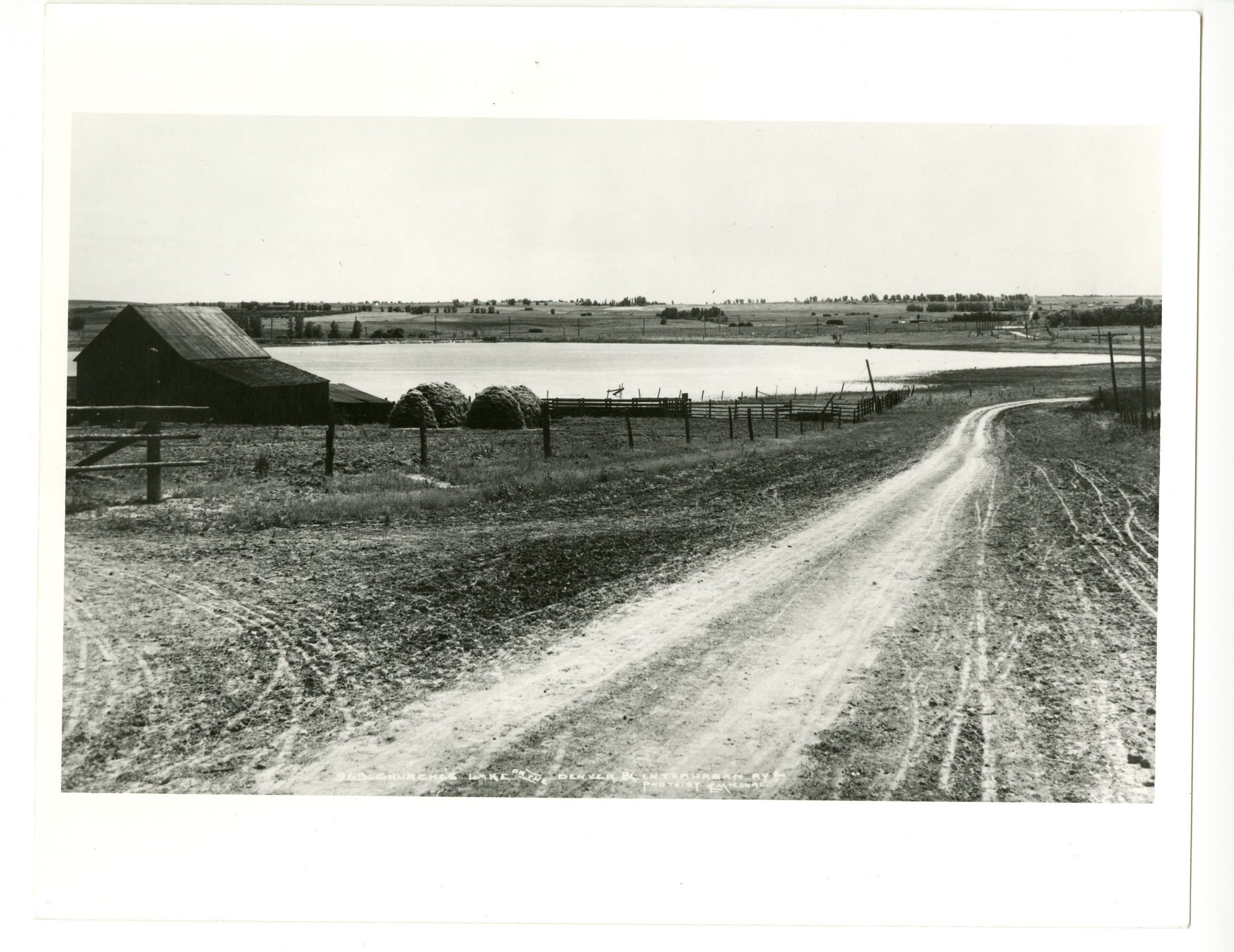 Photograph, black and white. Church lake on old Wadsworth - looking south - near the the Denver and Interurban Railway (visible in background). Photo from DPL Western History Department. Church Ranch Lake. Barn on far left with hay bales. Lake in middle ground, dirt road (Old Wadsworth?) to right.Collection